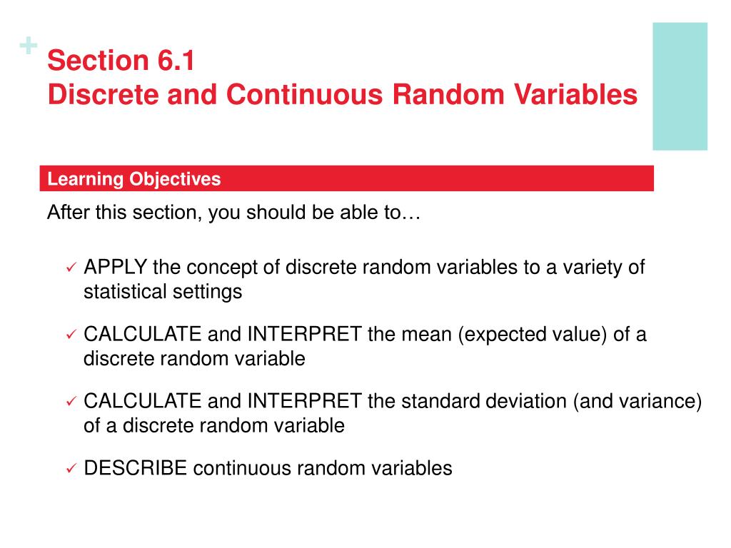 Section 6.1Discrete and Continuous Random Variables Learning Objectives After this section, you should be able to… • APPLY the concept of discrete random variables to a variety of statistical settings • CALCULATE and INTERPRET the mean (expected value) of a discrete random variable • CALCULATE and INTERPRET the standard deviation (and variance) of a discrete random variable • DESCRIBE continuous random variables