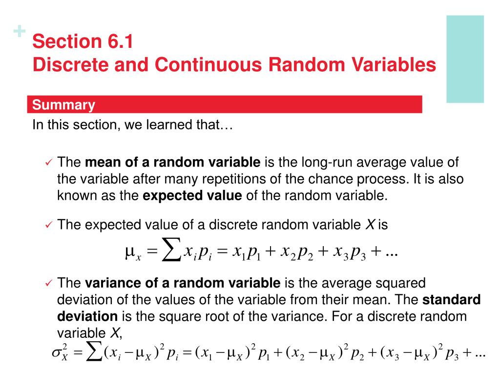 Section 6.1Discrete and Continuous Random Variables Summary In this section, we learned that… • The mean of a random variable is the long-run average value of the variable after many repetitions of the chance process. It is also known as the expected value of the random variable. • The expected value of a discrete random variable X is • The variance of a random variable is the average squared deviation of the values of the variable from their mean. The standard deviation is the square root of the variance. For a discrete random variable X,