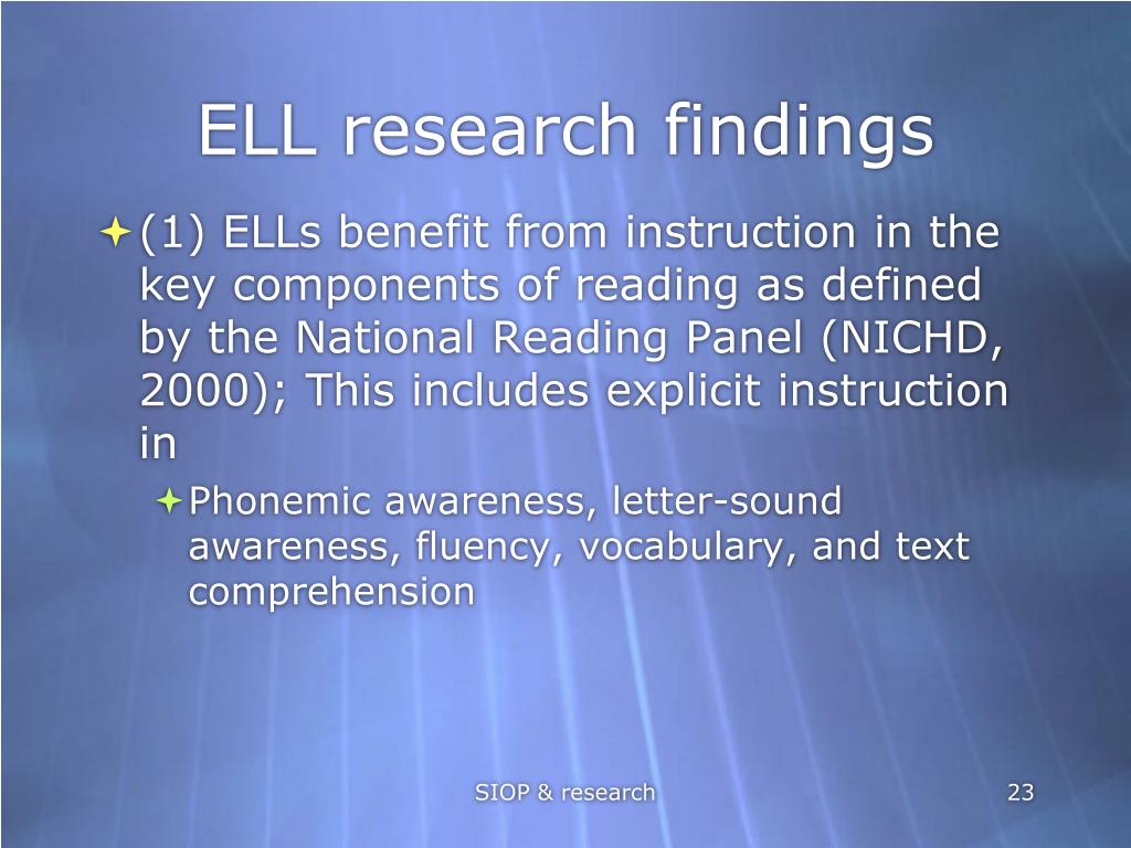 ELL research findings • (1) ELLs benefit from instruction in the key components of reading as defined by the National Reading Panel (NICHD, 2000); This includes explicit instruction in • Phonemic awareness, letter-sound awareness, fluency, vocabulary, and text comprehension SIOP & research