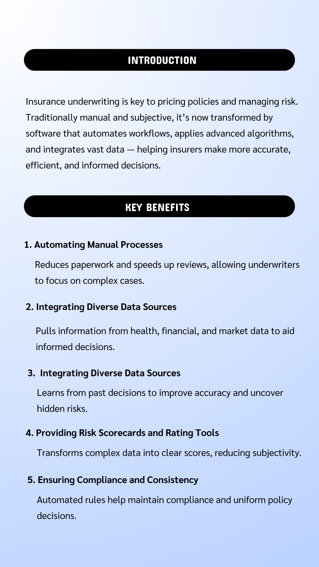 INTRODUCTION INTRODUCTION Insurance underwriting is key to pricing policies and managing risk. Traditionally manual and subjective, it’s now transformed by software that automates workflows, applies advanced algorithms, and integrates vast data — helping insurers make more accurate, efficient, and informed decisions. KEY BENEFITS 1. Automating Manual Processes Reduces paperwork and speeds up reviews, allowing underwriters to focus on complex cases. 2. Integrating Diverse Data Sources Pulls information from health, financial, and market data to aid informed decisions. 3. Integrating Diverse Data Sources Learns from past decisions to improve accuracy and uncover hidden risks. 4. Providing Risk Scorecards and Rating Tools Transforms complex data into clear scores, reducing subjectivity. 5. Ensuring Compliance and Consistency Automated rules help maintain compliance and uniform policy decisions.