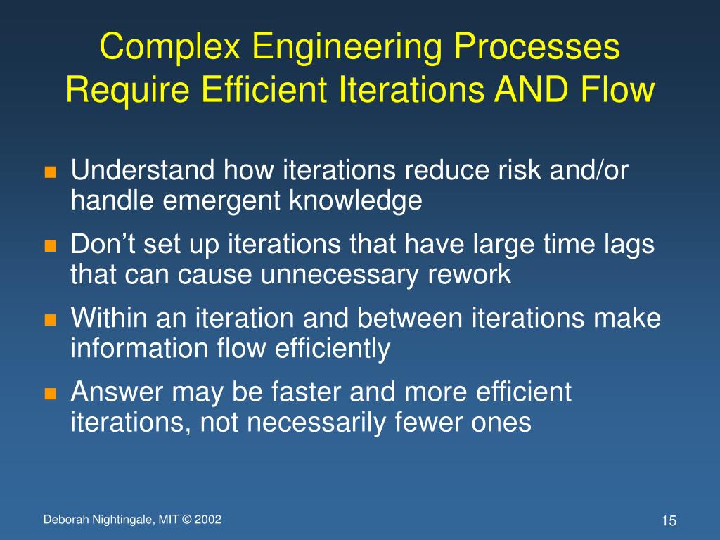Complex Engineering ProcessesRequire Efficient Iterations AND Flow • Understand how iterations reduce risk and/or handle emergent knowledge • Don’t set up iterations that have large time lags that can cause unnecessary rework • Within an iteration and between iterations make information flow efficiently • Answer may be faster and more efficient iterations, not necessarily fewer ones