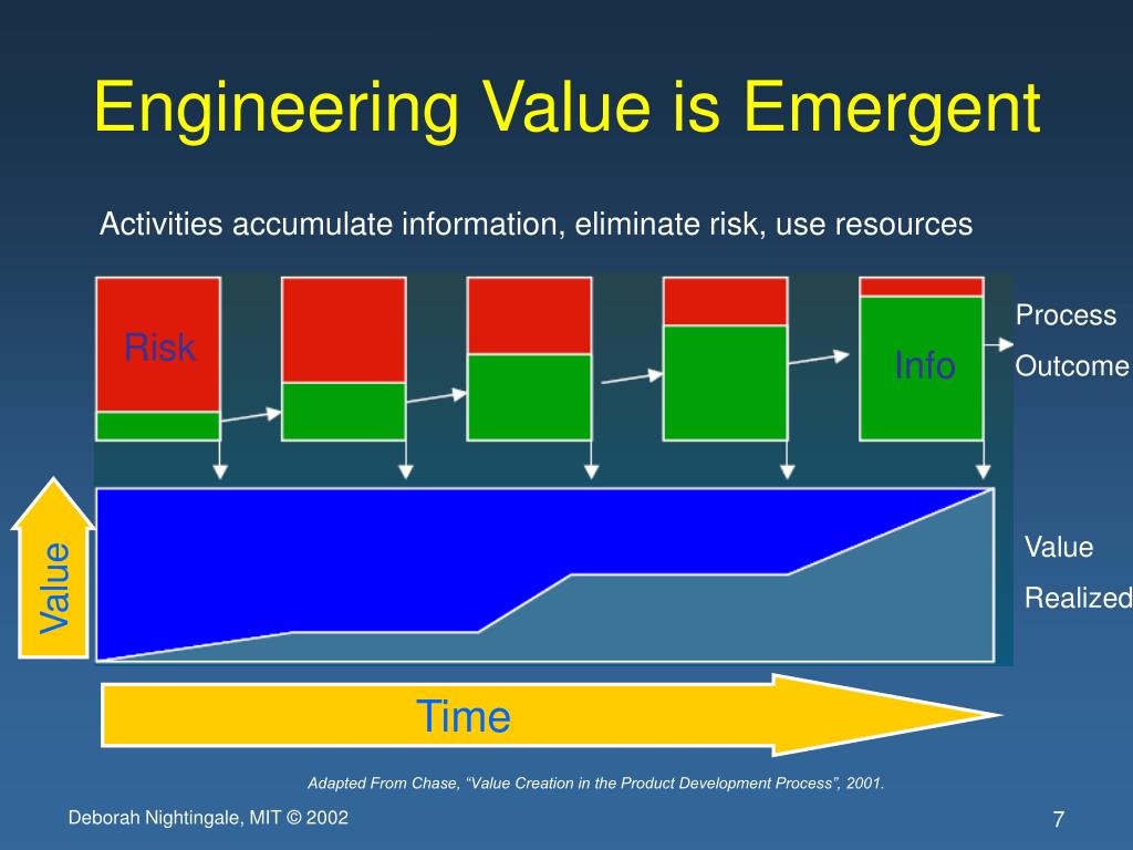 Engineering Value is Emergent Activities accumulate information, eliminate risk, use resources Process Outcome Risk Info Value Value Realized Time Adapted From Chase, “Value Creation in the Product Development Process”, 2001.