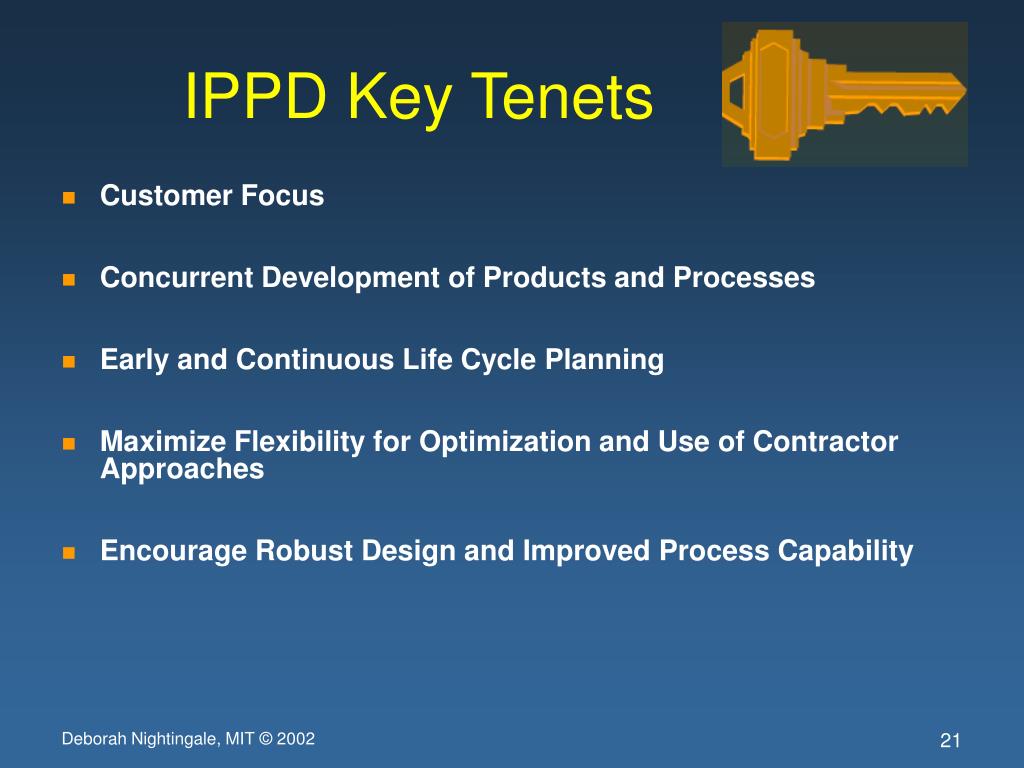 IPPD Key Tenets • Customer Focus • Concurrent Development of Products and Processes • Early and Continuous Life Cycle Planning • Maximize Flexibility for Optimization and Use of Contractor Approaches • Encourage Robust Design and Improved Process Capability