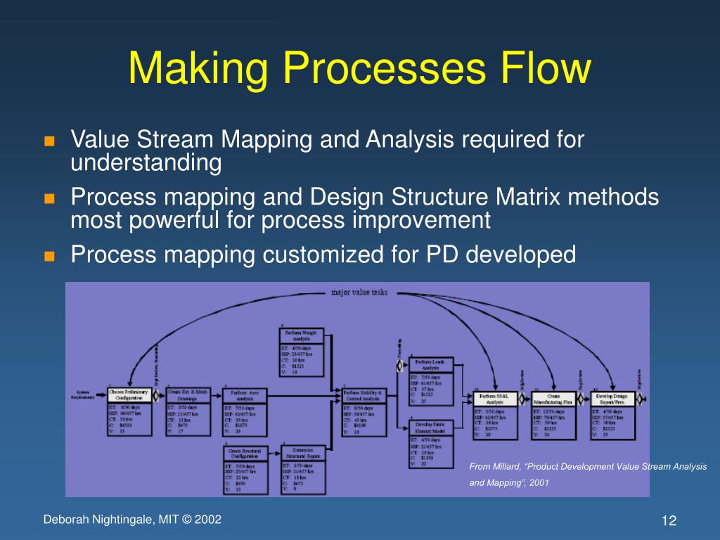 Making Processes Flow • Value Stream Mapping and Analysis required for understanding • Process mapping and Design Structure Matrix methods most powerful for process improvement • Process mapping customized for PD developed From Millard, “Product Development Value Stream Analysis and Mapping”, 2001