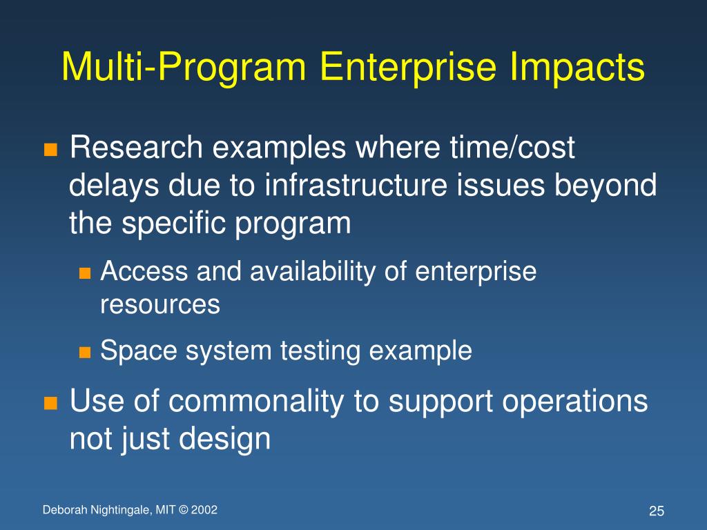 Multi-Program Enterprise Impacts • Research examples where time/cost delays due to infrastructure issues beyond the specific program • Access and availability of enterprise resources • Space system testing example • Use of commonality to support operations not just design