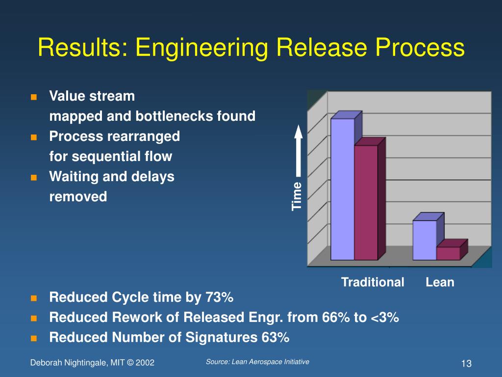 Results: Engineering Release Process • Value stream mapped and bottlenecks found • Process rearranged for sequential flow • Waiting and delays removed • Reduced Cycle time by 73% • Reduced Rework of Released Engr. from 66% to <3% • Reduced Number of Signatures 63% Time Traditional Lean Source: Lean Aerospace Initiative