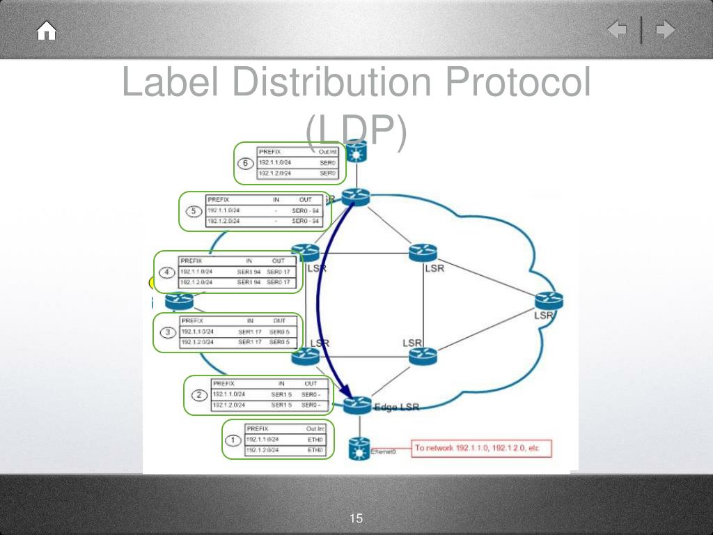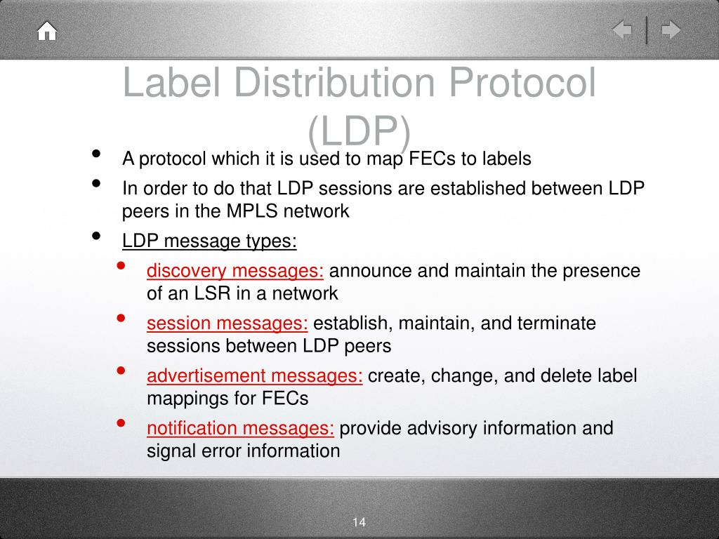 Label Distribution Protocol (LDP) • A protocol which it is used to map FECs to labels • In order to do that LDP sessions are established between LDP peers in the MPLS network • LDP message types: • discovery messages:announce and maintain the presence of an LSR in a network • session messages:establish, maintain, and terminate sessions between LDP peers • advertisement messages: create, change, and delete label mappings for FECs • notification messages: provide advisory information and signal error information