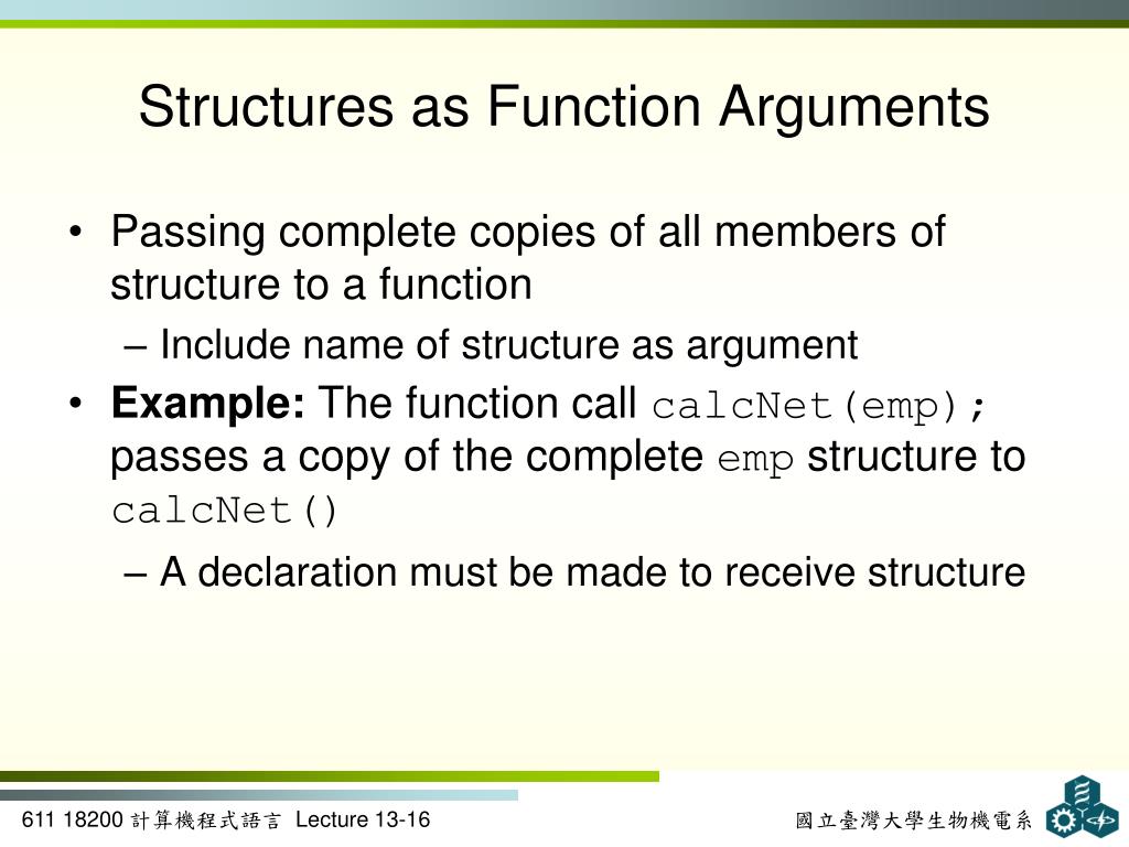 Structures as Function Arguments • Passing complete copies of all members of structure to a function • Include name of structure as argument • Example: The function call calcNet(emp); passes a copy of the complete emp structure to calcNet() • A declaration must be made to receive structure