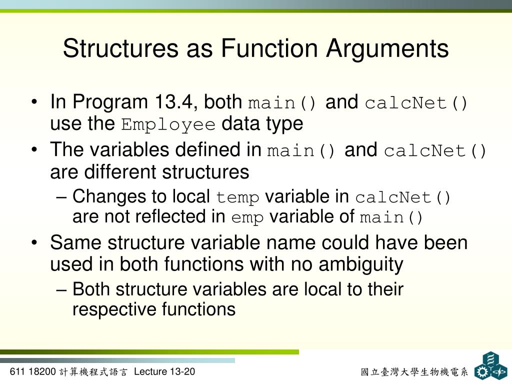 Structures as Function Arguments • In Program 13.4, both main() and calcNet() use the Employee data type • The variables defined in main() and calcNet() are different structures • Changes to local temp variable in calcNet() are not reflected in emp variable of main() • Same structure variable name could have been used in both functions with no ambiguity • Both structure variables are local to their respective functions
