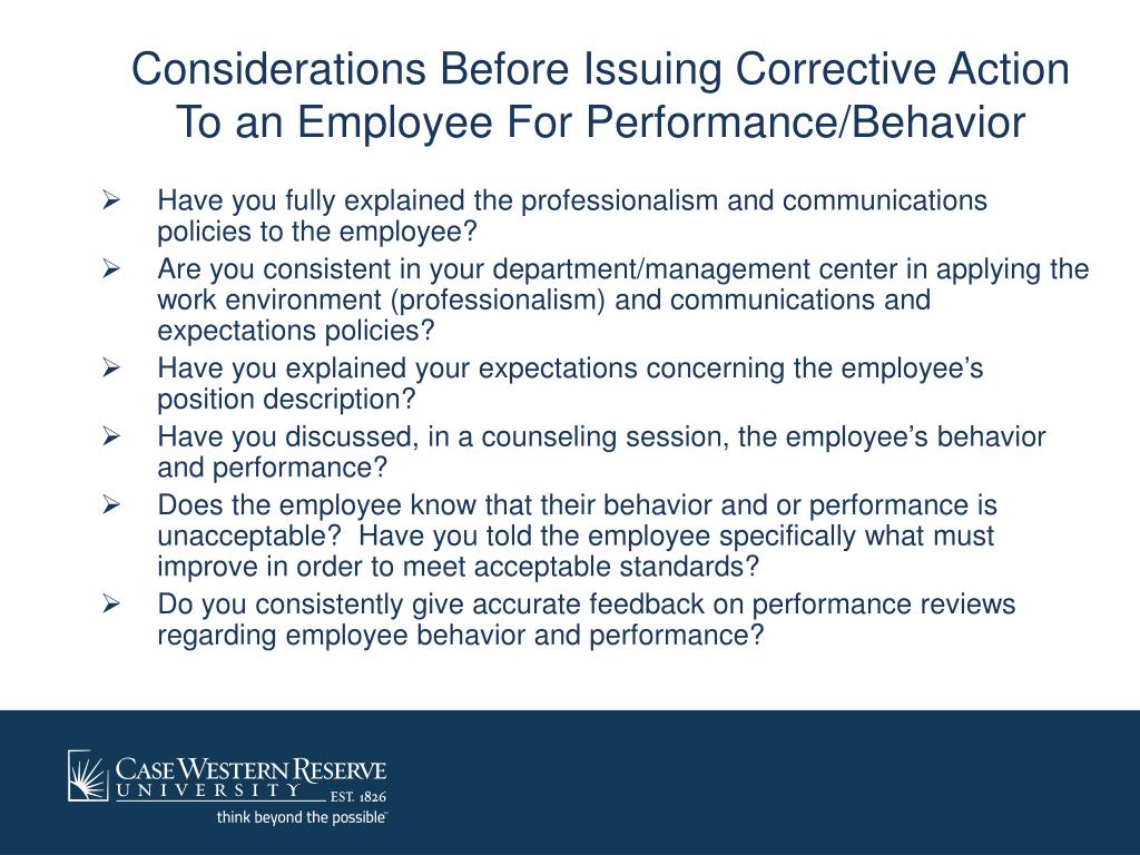 Have you fully explained the professionalism and communications policies to the employee? Are you consistent in your department/management center in applying the work environment (professionalism) and communications and expectations policies? Have you explained your expectations concerning the employee’s position description? Have you discussed, in a counseling session, the employee’s behavior and performance? Does the employee know that their behavior and or performance is unacceptable? Have you told the employee specifically what must improve in order to meet acceptable standards? Do you consistently give accurate feedback on performance reviews regarding employee behavior and performance? Considerations Before Issuing Corrective Action To an Employee For Performance/Behavior