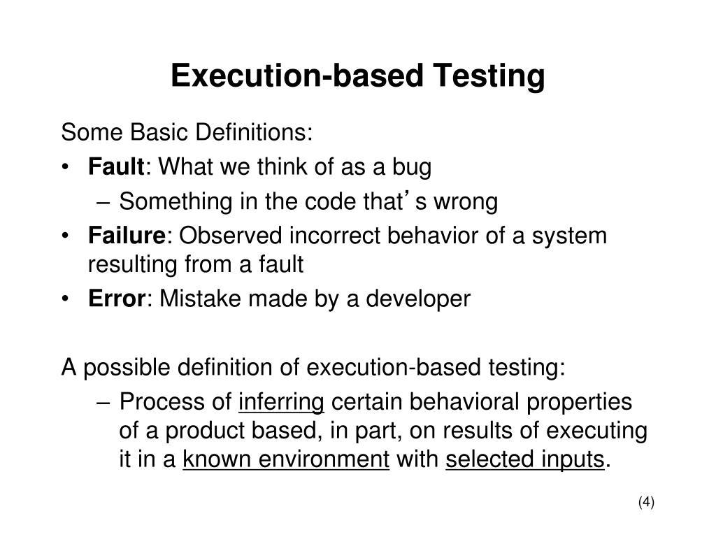 Execution-based Testing Some Basic Definitions: • Fault: What we think of as a bug • Something in the code that’s wrong • Failure: Observed incorrect behavior of a system resulting from a fault • Error: Mistake made by a developer A possible definition of execution-based testing: • Process of inferring certain behavioral properties of a product based, in part, on results of executing it in a known environment with selected inputs.