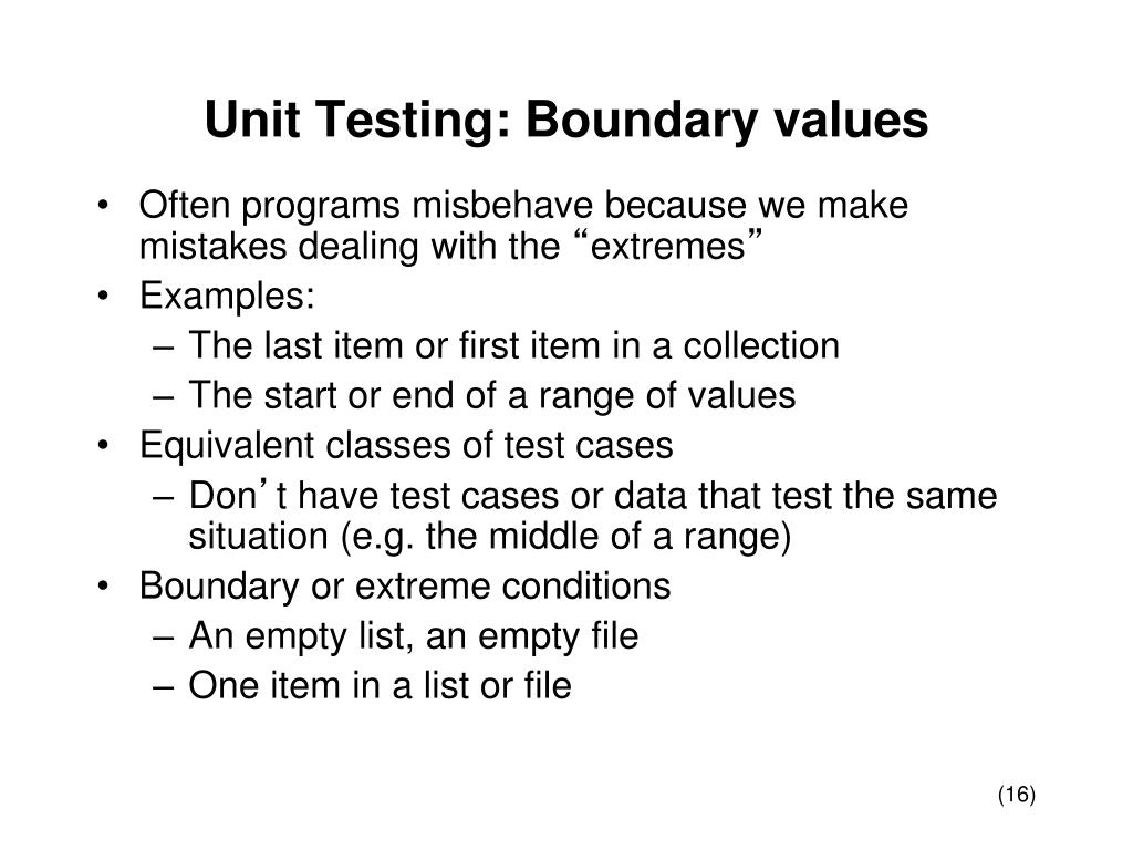 Unit Testing: Boundary values • Often programs misbehave because we make mistakes dealing with the “extremes” • Examples: • The last item or first item in a collection • The start or end of a range of values • Equivalent classes of test cases • Don’t have test cases or data that test the same situation (e.g. the middle of a range) • Boundary or extreme conditions • An empty list, an empty file • One item in a list or file