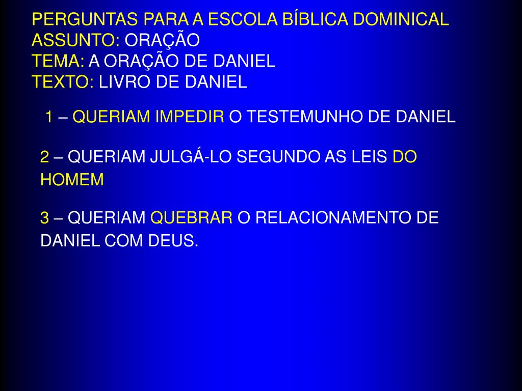 PERGUNTAS PARA A ESCOLA BÍBLICA DOMINICALASSUNTO: ORAÇÃOTEMA: A ORAÇÃO DE DANIELTEXTO: LIVRO DE DANIEL 1 – QUERIAM IMPEDIR O TESTEMUNHO DE DANIEL 2 – QUERIAM JULGÁ-LO SEGUNDO AS LEIS DO HOMEM 3 – QUERIAM QUEBRAR O RELACIONAMENTO DE DANIEL COM DEUS.