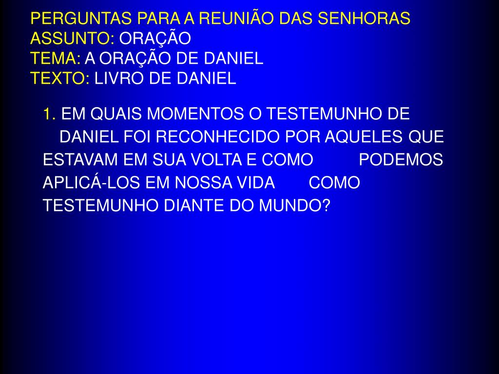 PERGUNTAS PARA A REUNIÃO DAS SENHORASASSUNTO: ORAÇÃOTEMA: A ORAÇÃO DE DANIELTEXTO: LIVRO DE DANIEL 1. EM QUAIS MOMENTOS O TESTEMUNHO DE DANIEL FOI RECONHECIDO POR AQUELES QUE ESTAVAM EM SUA VOLTA E COMO PODEMOS APLICÁ-LOS EM NOSSA VIDA COMO TESTEMUNHO DIANTE DO MUNDO?
