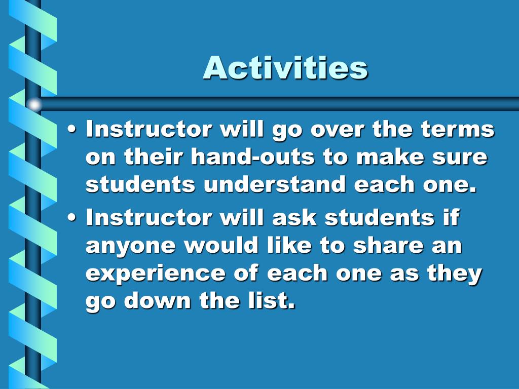 Activities • Instructor will go over the terms on their hand-outs to make sure students understand each one. • Instructor will ask students if anyone would like to share an experience of each one as they go down the list.