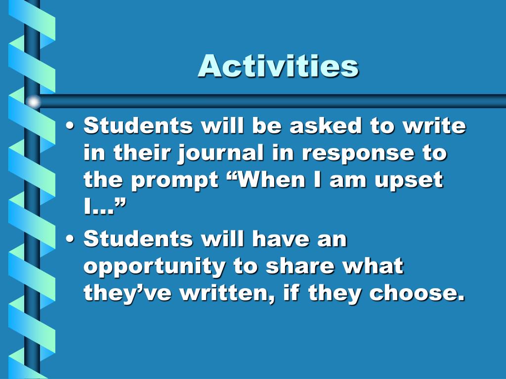 Activities • Students will be asked to write in their journal in response to the prompt “When I am upset I…” • Students will have an opportunity to share what they’ve written, if they choose.