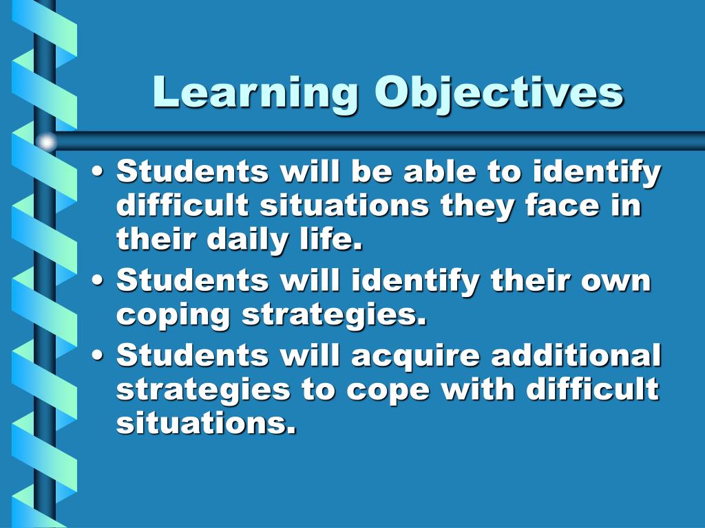 Learning Objectives • Students will be able to identify difficult situations they face in their daily life. • Students will identify their own coping strategies. • Students will acquire additional strategies to cope with difficult situations.