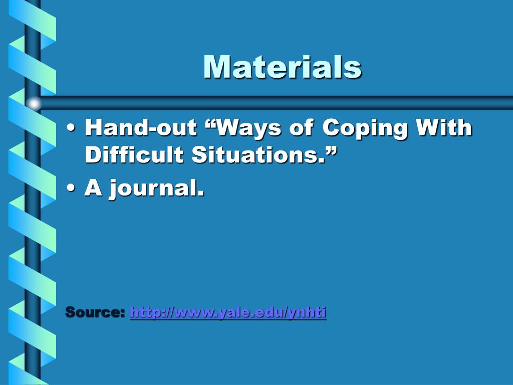 Materials • Hand-out “Ways of Coping With Difficult Situations.” • A journal. Source: http://www.yale.edu/ynhti