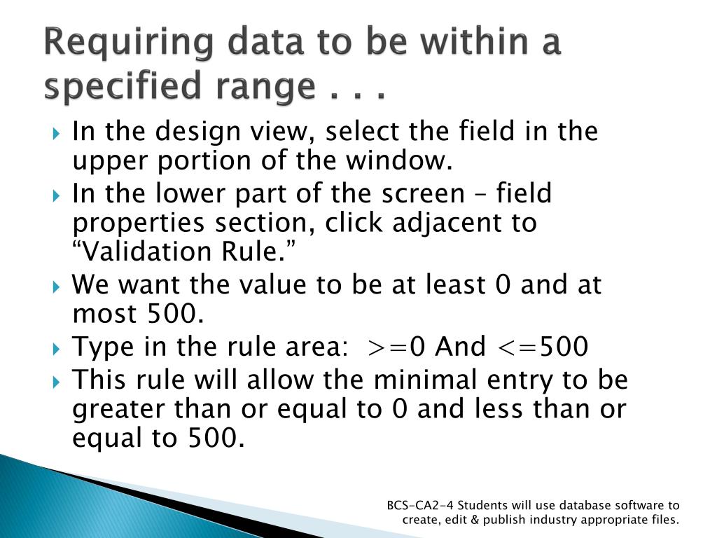 Specified range . . . • If a user accidentally entered a value outside of the acceptable range, we want the program to give them a message. • In the field properties section, in the “Validation Text” field, type the text: “Must be at least 0 and at most 500” BCS-CA2-4 Students will use database software to create, edit & publish industry appropriate files.