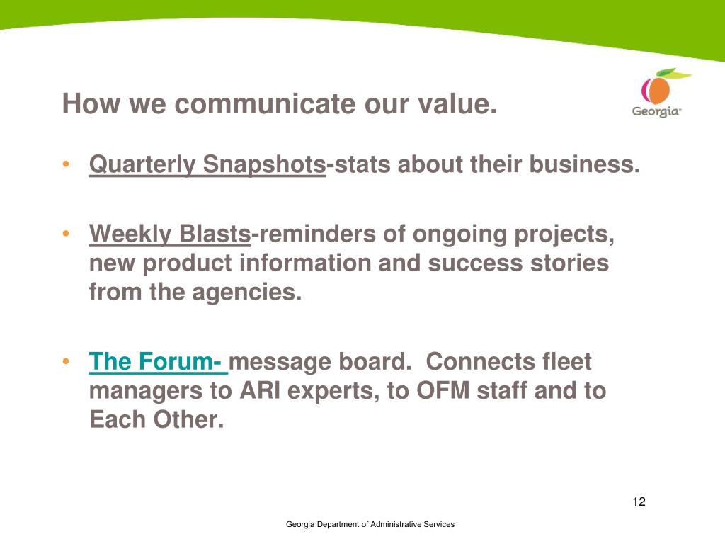 How we communicate our value. • Quarterly Snapshots-stats about their business. • Weekly Blasts-reminders of ongoing projects, new product information and success stories from the agencies. • The Forum- message board. Connects fleet managers to ARI experts, to OFM staff and to Each Other.