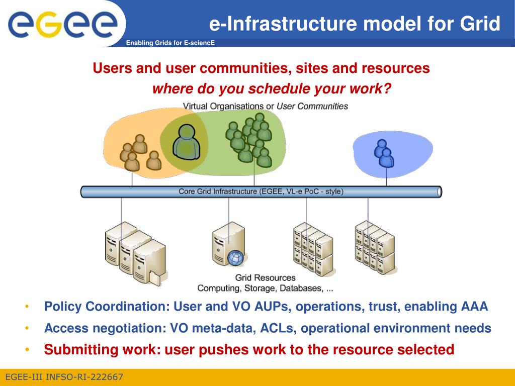 e-Infrastructure model for Grid Users and user communities, sites and resourceswhere do you schedule your work? Policy Coordination: User and VO AUPs, operations, trust, enabling AAA Access negotiation: VO meta-data, ACLs, operational environment needs Submitting work: user pushes work to the resource selected
