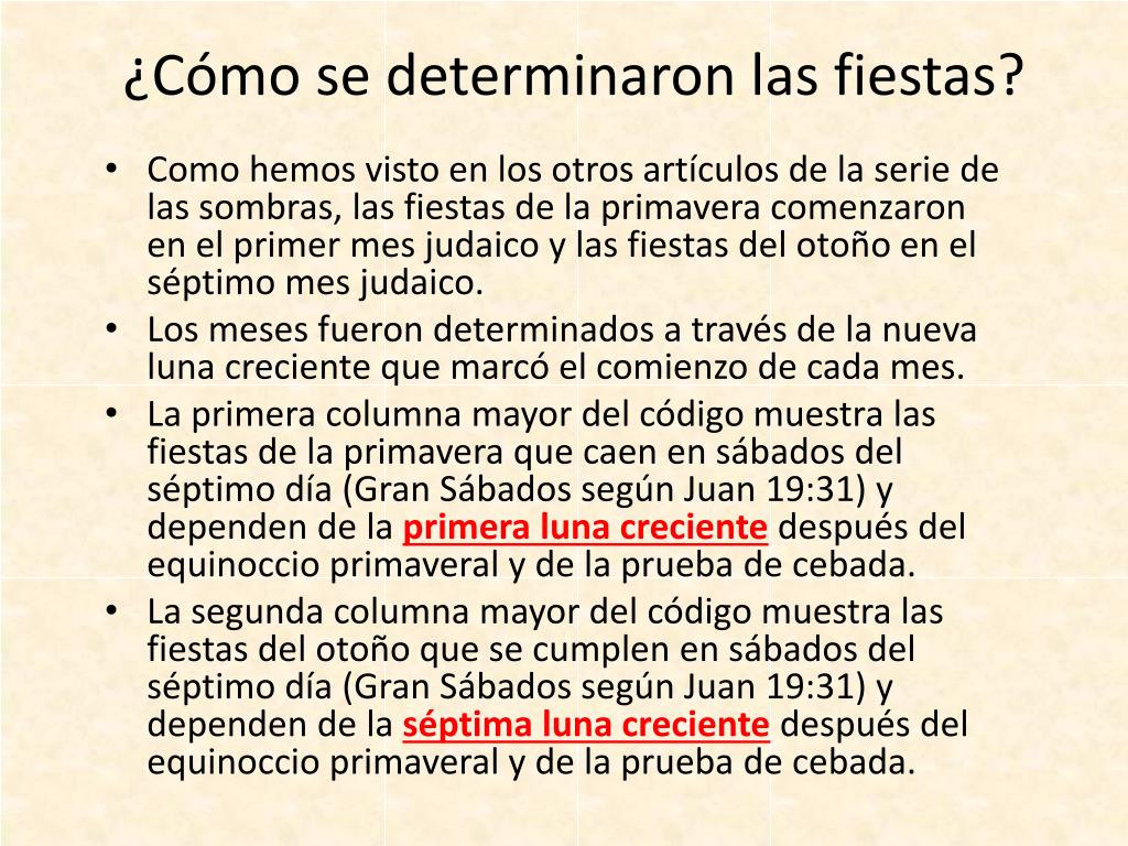 ¿Cómo se determinaron las fiestas? • Como hemos visto en los otros artículos de la serie de las sombras, las fiestas de la primavera comenzaron en el primer mes judaico y las fiestas del otoño en el séptimo mes judaico. • Los meses fueron determinados a través de la nueva luna creciente que marcó el comienzo de cada mes. • La primera columna mayor del código muestra las fiestas de la primavera que caen en sábados del séptimo día (Gran Sábados según Juan 19:31) y dependen de la primera luna crecientedespués del equinoccio primaveral y de la prueba de cebada. • La segunda columna mayor del código muestra las fiestas del otoño que se cumplen en sábados del séptimo día (Gran Sábados según Juan 19:31) y dependen de la séptima luna crecientedespués del equinoccio primaveral y de la prueba de cebada.
