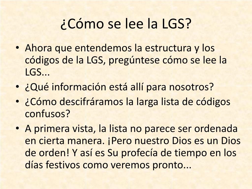 ¿Cómo se lee la LGS? • Ahora que entendemos la estructura y los códigos de la LGS, pregúntese cómo se lee la LGS... • ¿Qué información está allí para nosotros? • ¿Cómo descifráramos la larga lista de códigos confusos? • A primera vista, la lista no parece ser ordenada en cierta manera. ¡Pero nuestro Dios es un Dios de orden! Y así es Su profecía de tiempo en los días festivos como veremos pronto...