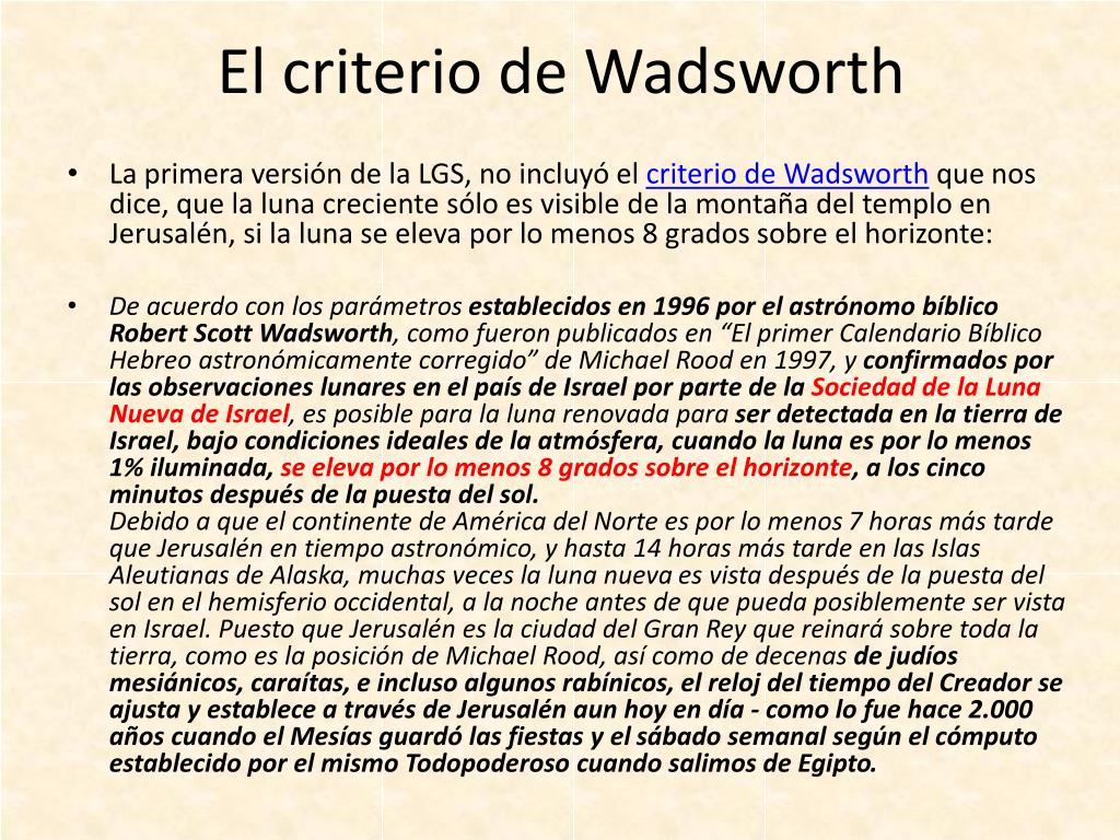 El criterio de Wadsworth • La primera versión de la LGS, no incluyó el criterio de Wadsworth que nos dice, que la luna creciente sólo es visible de la montaña del templo en Jerusalén, si la luna se eleva por lo menos 8 grados sobre el horizonte: • De acuerdo con los parámetros establecidos en 1996 por el astrónomo bíblico Robert Scott Wadsworth, como fueron publicados en “El primer Calendario Bíblico Hebreo astronómicamente corregido” de Michael Rooden 1997, y confirmados por las observaciones lunares en el país de Israel por parte de la Sociedad de la Luna Nueva de Israel, es posible para la luna renovada para ser detectada en la tierra de Israel, bajo condiciones ideales de la atmósfera, cuando la luna es por lo menos 1% iluminada, se eleva por lo menos 8 grados sobre el horizonte, a los cinco minutos después de la puesta del sol.Debido a que el continente de América del Norte es por lo menos 7 horas más tarde que Jerusalén en tiempo astronómico, y hasta 14 horas más tarde en las Islas Aleutianas de Alaska, muchas veces la luna nueva es vista después de la puesta del sol en el hemisferio occidental, a la noche antes de que pueda posiblemente ser vista en Israel. Puesto que Jerusalén es la ciudad del Gran Rey que reinará sobre toda la tierra, como es la posición de Michael Rood, así como de decenas de judíos mesiánicos, caraítas, e incluso algunos rabínicos, el reloj del tiempo del Creador se ajusta y establece a través de Jerusalén aun hoy en día - como lo fue hace 2.000 años cuando el Mesías guardó las fiestas y el sábado semanal según el cómputo establecido por el mismo Todopoderoso cuando salimos de Egipto.
