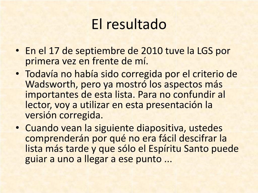 El resultado • En el 17 de septiembre de 2010 tuve la LGS por primera vez en frente de mí. • Todavía no había sido corregida por el criterio de Wadsworth, pero ya mostró los aspectos más importantes de esta lista. Para no confundir al lector, voy a utilizar en esta presentación la versión corregida. • Cuando vean la siguiente diapositiva, ustedes comprenderán por qué no era fácil descifrar la lista más tarde y que sólo el Espíritu Santo puede guiar a uno a llegar a ese punto ...