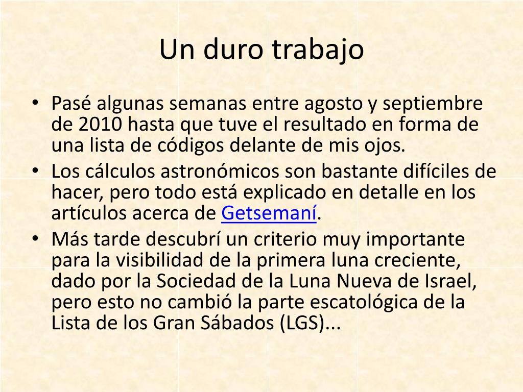 Un duro trabajo • Pasé algunas semanas entre agosto y septiembre de 2010 hasta que tuve el resultado en forma de una lista de códigos delante de mis ojos. • Los cálculos astronómicos son bastante difíciles de hacer, pero todo está explicado en detalle en los artículos acerca de Getsemaní. • Más tarde descubrí un criterio muy importante para la visibilidad de la primera luna creciente, dado por la Sociedad de la Luna Nueva de Israel, pero esto no cambió la parte escatológica de la Lista de los Gran Sábados (LGS)...