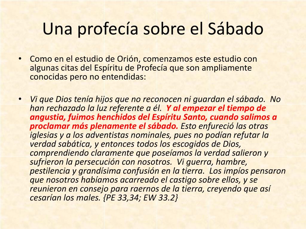 Una profecía sobre el Sábado • Como en el estudio de Orión, comenzamos este estudio con algunas citas del Espíritu de Profecía que son ampliamente conocidas pero no entendidas: • Vi que Dios tenía hijos que no reconocen ni guardan el sábado. No han rechazado la luz referente a él. Y al empezar el tiempo de angustia, fuimos henchidos del Espíritu Santo, cuando salimos a proclamar más plenamente el sábado.Esto enfureció las otras iglesias y a los adventistas nominales, pues no podían refutar la verdad sabática, y entonces todos los escogidos de Dios, comprendiendo claramente que poseíamos la verdad salieron y sufrieron la persecución con nosotros. Vi guerra, hambre, pestilencia y grandísima confusión en la tierra. Los impíos pensaron que nosotros habíamos acarreado el castigo sobre ellos, y se reunieron en consejo para raernos de la tierra, creyendo que así cesarían los males. {PE 33,34; EW 33.2}
