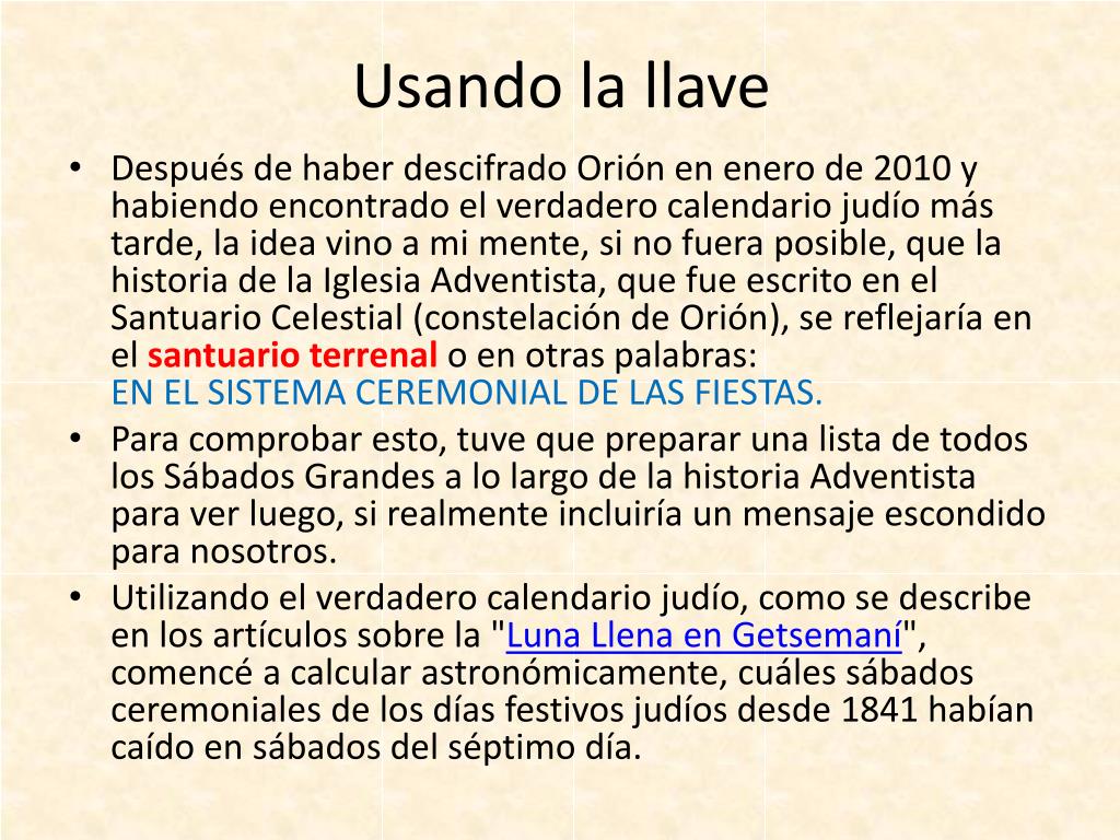 Usando la llave • Después de haber descifrado Orión en enero de 2010 y habiendo encontrado el verdadero calendario judío más tarde, la idea vino a mi mente, si no fuera posible, que la historia de la Iglesia Adventista, que fue escrito en el Santuario Celestial (constelación de Orión), se reflejaría en el santuario terrenal o en otras palabras: EN EL SISTEMA CEREMONIAL DE LAS FIESTAS. • Para comprobar esto, tuve que preparar una lista de todos los Sábados Grandes a lo largo de la historia Adventista para ver luego, si realmente incluiría un mensaje escondido para nosotros. • Utilizando el verdadero calendario judío, como se describe en los artículos sobre la "Luna Llena en Getsemaní", comencé a calcular astronómicamente, cuáles sábados ceremoniales de los días festivos judíos desde 1841 habían caído en sábados del séptimo día.