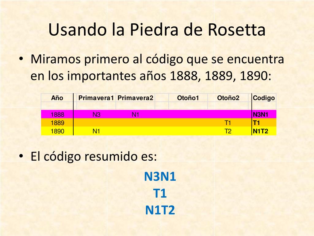 Usando la Piedra de Rosetta • Miramos primero al código que se encuentra en los importantes años 1888, 1889, 1890: • El código resumido es: N3N1T1N1T2