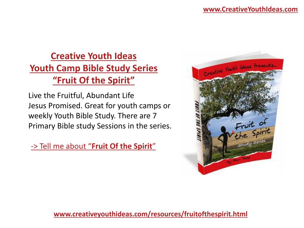 www.CreativeYouthIdeas.com Creative Youth IdeasYouth Camp Bible Study Series“Fruit Of the Spirit” Live the Fruitful, Abundant Life Jesus Promised. Great for youth camps or weekly Youth Bible Study. There are 7 Primary Bible study Sessions in the series. -> Tell me about “Fruit Of the Spirit” www.creativeyouthideas.com/resources/fruitofthespirit.html
