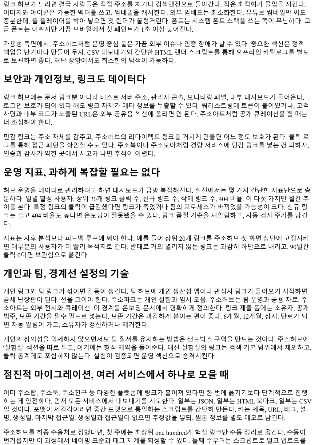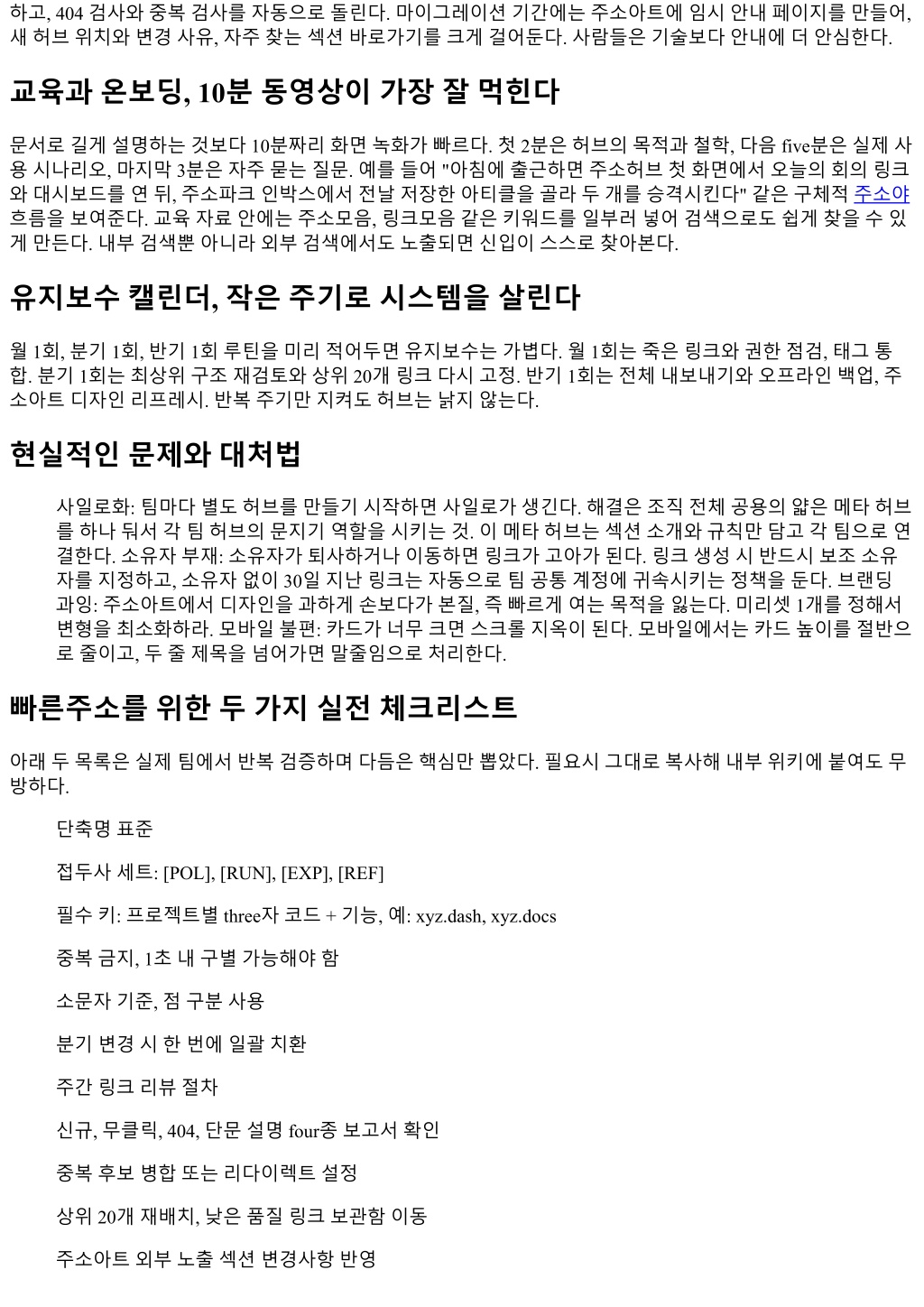 하고, 404 검사와중복검사를자동으로돌린다. 마이그레이션기간에는주소아트에임시안내페이지를만들어, 새허브위치와변경사유, 자주찾는섹션바로가기를크게걸어둔다. 사람들은기술보다안내에더안심한다. 교육과온보딩, 10분동영상이가장잘먹힌다 문서로길게설명하는것보다 10분짜리화면녹화가빠르다. 첫 2분은허브의목적과철학, 다음 five분은실제사 용시나리오, 마지막 3분은자주묻는질문. 예를들어 "아침에출근하면주소허브첫화면에서오늘의회의링크 와대시보드를연뒤, 주소파크인박스에서전날저장한아티클을골라두개를승격시킨다" 같은구체적주소야 흐름을보여준다. 교육자료안에는주소모음, 링크모음같은키워드를일부러넣어검색으로도쉽게찾을수있 게만든다. 내부검색뿐아니라외부검색에서도노출되면신입이스스로찾아본다. 유지보수캘린더, 작은주기로시스템을살린다 월 1회, 분기 1회, 반기 1회루틴을미리적어두면유지보수는가볍다. 월 1회는죽은링크와권한점검, 태그통 합. 분기 1회는최상위구조재검토와상위 20개링크다시고정. 반기 1회는전체내보내기와오프라인백업, 주 소아트디자인리프레시. 반복주기만지켜도허브는낡지않는다. 현실적인문제와대처법 사일로화: 팀마다별도허브를만들기시작하면사일로가생긴다. 해결은조직전체공용의얇은메타허브 를하나둬서각팀허브의문지기역할을시키는것. 이메타허브는섹션소개와규칙만담고각팀으로연 결한다. 소유자부재: 소유자가퇴사하거나이동하면링크가고아가된다. 링크생성시반드시보조소유 자를지정하고, 소유자없이 30일지난링크는자동으로팀공통계정에귀속시키는정책을둔다. 브랜딩 과잉: 주소아트에서디자인을과하게손보다가본질, 즉빠르게여는목적을잃는다. 미리셋 1개를정해서 변형을최소화하라. 모바일불편: 카드가너무크면스크롤지옥이된다. 모바일에서는카드높이를절반으 로줄이고, 두줄제목을넘어가면말줄임으로처리한다. 빠른주소를위한두가지실전체크리스트 아래두목록은실제팀에서반복검증하며다듬은핵심만뽑았다. 필요시그대로복사해내부위키에붙여도무 방하다. 단축명표준 접두사세트: [POL], [RUN], [EXP], [REF] 필수키: 프로젝트별 three자코드 + 기능, 예: xyz.dash, xyz.docs 중복금지, 1초내구별가능해야함 소문자기준, 점구분사용 분기변경시한번에일괄치환 주간링크리뷰절차 신규, 무클릭, 404, 단문설명 four종보고서확인 중복후보병합또는리다이렉트설정 상위 20개재배치, 낮은품질링크보관함이동 주소아트외부노출섹션변경사항반영