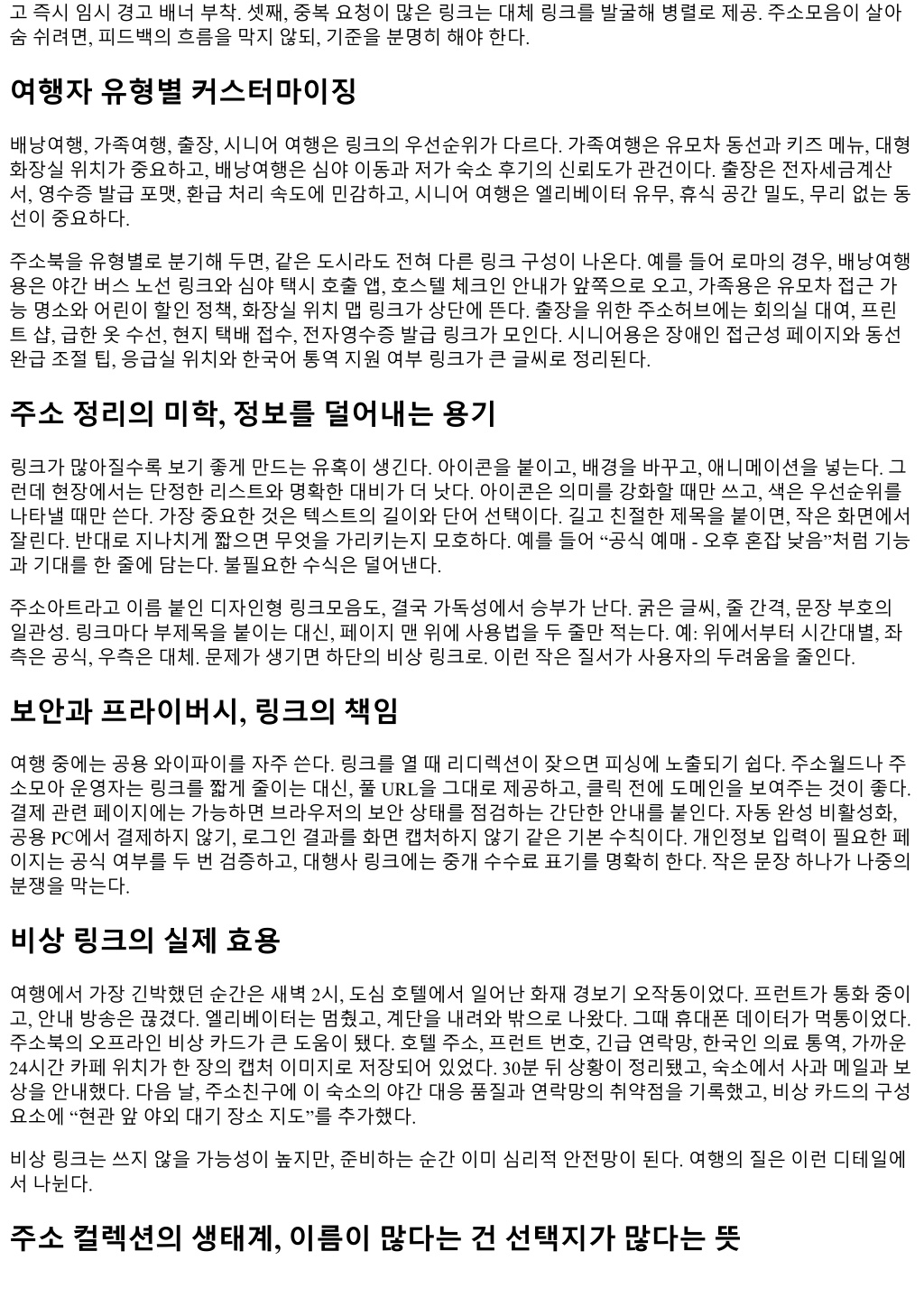 고즉시임시경고배너부착. 셋째, 중복요청이많은링크는대체링크를발굴해병렬로제공. 주소모음이살아 숨쉬려면, 피드백의흐름을막지않되, 기준을분명히해야한다. 여행자유형별커스터마이징 배낭여행, 가족여행, 출장, 시니어여행은링크의우선순위가다르다. 가족여행은유모차동선과키즈메뉴, 대형 화장실위치가중요하고, 배낭여행은심야이동과저가숙소후기의신뢰도가관건이다. 출장은전자세금계산 서, 영수증발급포맷, 환급처리속도에민감하고, 시니어여행은엘리베이터유무, 휴식공간밀도, 무리없는동 선이중요하다. 주소북을유형별로분기해두면, 같은도시라도전혀다른링크구성이나온다. 예를들어로마의경우, 배낭여행 용은야간버스노선링크와심야택시호출앱, 호스텔체크인안내가앞쪽으로오고, 가족용은유모차접근가 능명소와어린이할인정책, 화장실위치맵링크가상단에뜬다. 출장을위한주소허브에는회의실대여, 프린 트샵, 급한옷수선, 현지택배접수, 전자영수증발급링크가모인다. 시니어용은장애인접근성페이지와동선 완급조절팁, 응급실위치와한국어통역지원여부링크가큰글씨로정리된다. 주소정리의미학, 정보를덜어내는용기 링크가많아질수록보기좋게만드는유혹이생긴다. 아이콘을붙이고, 배경을바꾸고, 애니메이션을넣는다. 그 런데현장에서는단정한리스트와명확한대비가더낫다. 아이콘은의미를강화할때만쓰고, 색은우선순위를 나타낼때만쓴다. 가장중요한것은텍스트의길이와단어선택이다. 길고친절한제목을붙이면, 작은화면에서 잘린다. 반대로지나치게짧으면무엇을가리키는지모호하다. 예를들어 “공식예매 - 오후혼잡낮음”처럼기능 과기대를한줄에담는다. 불필요한수식은덜어낸다. 주소아트라고이름붙인디자인형링크모음도, 결국가독성에서승부가난다. 굵은글씨, 줄간격, 문장부호의 일관성. 링크마다부제목을붙이는대신, 페이지맨위에사용법을두줄만적는다. 예: 위에서부터시간대별, 좌 측은공식, 우측은대체. 문제가생기면하단의비상링크로. 이런작은질서가사용자의두려움을줄인다. 보안과프라이버시, 링크의책임 여행중에는공용와이파이를자주쓴다. 링크를열때리디렉션이잦으면피싱에노출되기쉽다. 주소월드나주 소모아운영자는링크를짧게줄이는대신, 풀 URL을그대로제공하고, 클릭전에도메인을보여주는것이좋다. 결제관련페이지에는가능하면브라우저의보안상태를점검하는간단한안내를붙인다. 자동완성비활성화, 공용 PC에서결제하지않기, 로그인결과를화면캡처하지않기같은기본수칙이다. 개인정보입력이필요한페 이지는공식여부를두번검증하고, 대행사링크에는중개수수료표기를명확히한다. 작은문장하나가나중의 분쟁을막는다. 비상링크의실제효용 여행에서가장긴박했던순간은새벽 2시, 도심호텔에서일어난화재경보기오작동이었다. 프런트가통화중이 고, 안내방송은끊겼다. 엘리베이터는멈췄고, 계단을내려와밖으로나왔다. 그때휴대폰데이터가먹통이었다. 주소북의오프라인비상카드가큰도움이됐다. 호텔주소, 프런트번호, 긴급연락망, 한국인의료통역, 가까운 24시간카페위치가한장의캡처이미지로저장되어있었다. 30분뒤상황이정리됐고, 숙소에서사과메일과보 상을안내했다. 다음날, 주소친구에이숙소의야간대응품질과연락망의취약점을기록했고, 비상카드의구성 요소에 “현관앞야외대기장소지도”를추가했다. 비상링크는쓰지않을가능성이높지만, 준비하는순간이미심리적안전망이된다. 여행의질은이런디테일에 서나뉜다. 주소컬렉션의생태계, 이름이많다는건선택지가많다는뜻