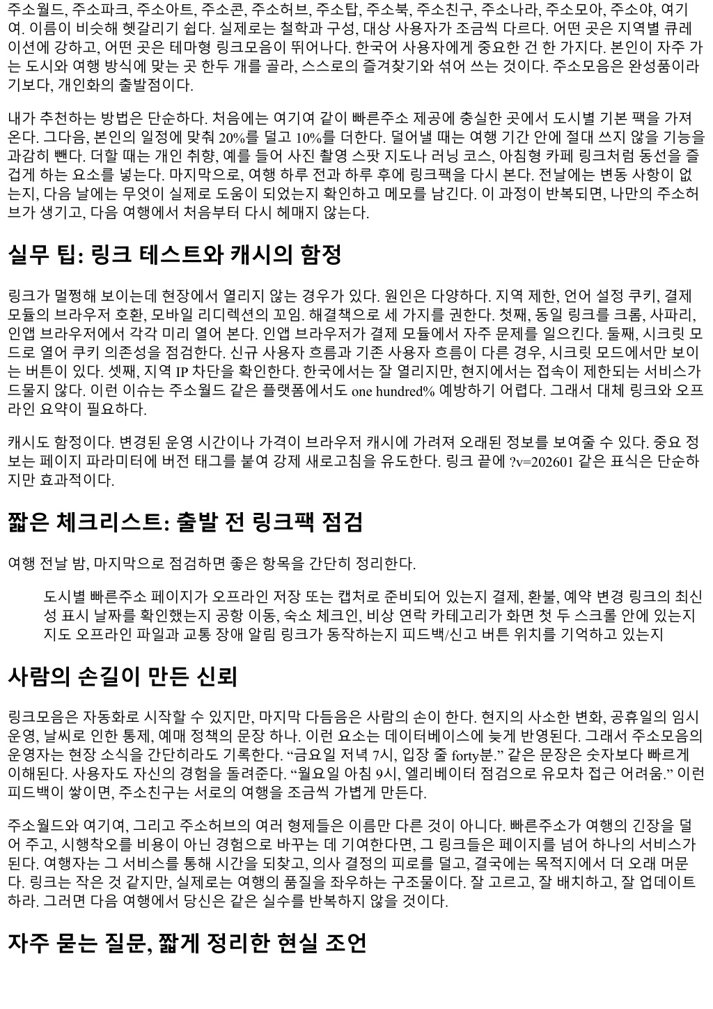 주소월드, 주소파크, 주소아트, 주소콘, 주소허브, 주소탑, 주소북, 주소친구, 주소나라, 주소모아, 주소야, 여기 여. 이름이비슷해헷갈리기쉽다. 실제로는철학과구성, 대상사용자가조금씩다르다. 어떤곳은지역별큐레 이션에강하고, 어떤곳은테마형링크모음이뛰어나다. 한국어사용자에게중요한건한가지다. 본인이자주가 는도시와여행방식에맞는곳한두개를골라, 스스로의즐겨찾기와섞어쓰는것이다. 주소모음은완성품이라 기보다, 개인화의출발점이다. 내가추천하는방법은단순하다. 처음에는여기여같이빠른주소제공에충실한곳에서도시별기본팩을가져 온다. 그다음, 본인의일정에맞춰 20%를덜고 10%를더한다. 덜어낼때는여행기간안에절대쓰지않을기능을 과감히뺀다. 더할때는개인취향, 예를들어사진촬영스팟지도나러닝코스, 아침형카페링크처럼동선을즐 겁게하는요소를넣는다. 마지막으로, 여행하루전과하루후에링크팩을다시본다. 전날에는변동사항이없 는지, 다음날에는무엇이실제로도움이되었는지확인하고메모를남긴다. 이과정이반복되면, 나만의주소허 브가생기고, 다음여행에서처음부터다시헤매지않는다. 실무팁: 링크테스트와캐시의함정 링크가멀쩡해보이는데현장에서열리지않는경우가있다. 원인은다양하다. 지역제한, 언어설정쿠키, 결제 모듈의브라우저호환, 모바일리디렉션의꼬임. 해결책으로세가지를권한다. 첫째, 동일링크를크롬, 사파리, 인앱브라우저에서각각미리열어본다. 인앱브라우저가결제모듈에서자주문제를일으킨다. 둘째, 시크릿모 드로열어쿠키의존성을점검한다. 신규사용자흐름과기존사용자흐름이다른경우, 시크릿모드에서만보이 는버튼이있다. 셋째, 지역 IP 차단을확인한다. 한국에서는잘열리지만, 현지에서는접속이제한되는서비스가 드물지않다. 이런이슈는주소월드같은플랫폼에서도 one hundred% 예방하기어렵다. 그래서대체링크와오프 라인요약이필요하다. 캐시도함정이다. 변경된운영시간이나가격이브라우저캐시에가려져오래된정보를보여줄수있다. 중요정 보는페이지파라미터에버전태그를붙여강제새로고침을유도한다. 링크끝에 ?v=202601 같은표식은단순하 지만효과적이다. 짧은체크리스트: 출발전링크팩점검 여행전날밤, 마지막으로점검하면좋은항목을간단히정리한다. 도시별빠른주소페이지가오프라인저장또는캡처로준비되어있는지결제, 환불, 예약변경링크의최신 성표시날짜를확인했는지공항이동, 숙소체크인, 비상연락카테고리가화면첫두스크롤안에있는지 지도오프라인파일과교통장애알림링크가동작하는지피드백/신고버튼위치를기억하고있는지 사람의손길이만든신뢰 링크모음은자동화로시작할수있지만, 마지막다듬음은사람의손이한다. 현지의사소한변화, 공휴일의임시 운영, 날씨로인한통제, 예매정책의문장하나. 이런요소는데이터베이스에늦게반영된다. 그래서주소모음의 운영자는현장소식을간단히라도기록한다. “금요일저녁 7시, 입장줄 forty분.” 같은문장은숫자보다빠르게 이해된다. 사용자도자신의경험을돌려준다. “월요일아침 9시, 엘리베이터점검으로유모차접근어려움.” 이런 피드백이쌓이면, 주소친구는서로의여행을조금씩가볍게만든다. 주소월드와여기여, 그리고주소허브의여러형제들은이름만다른것이아니다. 빠른주소가여행의긴장을덜 어주고, 시행착오를비용이아닌경험으로바꾸는데기여한다면, 그링크들은페이지를넘어하나의서비스가 된다. 여행자는그서비스를통해시간을되찾고, 의사결정의피로를덜고, 결국에는목적지에서더오래머문 다. 링크는작은것같지만, 실제로는여행의품질을좌우하는구조물이다. 잘고르고, 잘배치하고, 잘업데이트 하라. 그러면다음여행에서당신은같은실수를반복하지않을것이다. 자주묻는질문, 짧게정리한현실조언