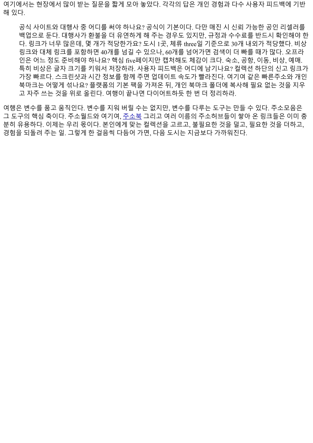 여기에서는현장에서많이받는질문을짧게모아놓았다. 각각의답은개인경험과다수사용자피드백에기반 해있다. 공식사이트와대행사중어디를써야하나요? 공식이기본이다. 다만매진시신뢰가능한공인리셀러를 백업으로둔다. 대행사가환불을더유연하게해주는경우도있지만, 규정과수수료를반드시확인해야한 다. 링크가너무많은데, 몇개가적당한가요? 도시 1곳, 체류 three일기준으로 30개내외가적당했다. 비상 링크와대체링크를포함하면 40개를넘길수있으나, 60개를넘어가면검색이더빠를때가많다. 오프라 인은어느정도준비해야하나요? 핵심 five페이지만캡처해도체감이크다. 숙소, 공항, 이동, 비상, 예매. 특히비상은글자크기를키워서저장하라. 사용자피드백은어디에남기나요? 컬렉션하단의신고링크가 가장빠르다. 스크린샷과시간정보를함께주면업데이트속도가빨라진다. 여기여같은빠른주소와개인 북마크는어떻게섞나요? 플랫폼의기본팩을가져온뒤, 개인북마크폴더에복사해필요없는것을지우 고자주쓰는것을위로올린다. 여행이끝나면다이어트하듯한번더정리하라. 여행은변수를품고움직인다. 변수를지워버릴수는없지만, 변수를다루는도구는만들수있다. 주소모음은 그도구의핵심축이다. 주소월드와여기여, 주소북그리고여러이름의주소허브들이쌓아온링크들은이미충 분히유용하다. 이제는우리몫이다. 본인에게맞는컬렉션을고르고, 불필요한것을덜고, 필요한것을더하고, 경험을되돌려주는일. 그렇게한걸음씩다듬어가면, 다음도시는지금보다가까워진다.
