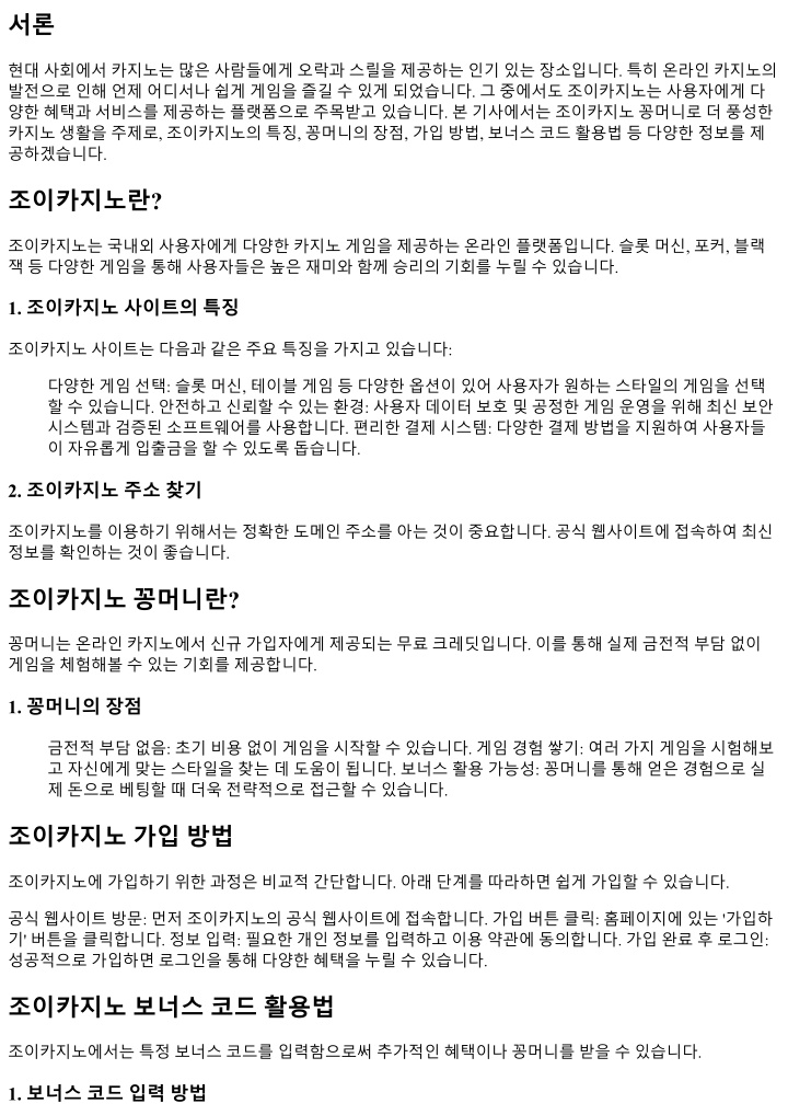 서론 현대사회에서카지노는많은사람들에게오락과스릴을제공하는인기있는장소입니다. 특히온라인카지노의 발전으로인해언제어디서나쉽게게임을즐길수있게되었습니다. 그중에서도조이카지노는사용자에게다 양한혜택과서비스를제공하는플랫폼으로주목받고있습니다. 본기사에서는조이카지노꽁머니로더풍성한 카지노생활을주제로, 조이카지노의특징, 꽁머니의장점, 가입방법, 보너스코드활용법등다양한정보를제 공하겠습니다. 조이카지노란? 조이카지노는국내외사용자에게다양한카지노게임을제공하는온라인플랫폼입니다. 슬롯머신, 포커, 블랙 잭등다양한게임을통해사용자들은높은재미와함께승리의기회를누릴수있습니다. 1. 조이카지노사이트의특징 조이카지노사이트는다음과같은주요특징을가지고있습니다: 다양한게임선택: 슬롯머신, 테이블게임등다양한옵션이있어사용자가원하는스타일의게임을선택 할수있습니다. 안전하고신뢰할수있는환경: 사용자데이터보호및공정한게임운영을위해최신보안 시스템과검증된소프트웨어를사용합니다. 편리한결제시스템: 다양한결제방법을지원하여사용자들 이자유롭게입출금을할수있도록돕습니다. 2. 조이카지노주소찾기 조이카지노를이용하기위해서는정확한도메인주소를아는것이중요합니다. 공식웹사이트에접속하여최신 정보를확인하는것이좋습니다. 조이카지노꽁머니란? 꽁머니는온라인카지노에서신규가입자에게제공되는무료크레딧입니다. 이를통해실제금전적부담없이 게임을체험해볼수있는기회를제공합니다. 1. 꽁머니의장점 금전적부담없음: 초기비용없이게임을시작할수있습니다. 게임경험쌓기: 여러가지게임을시험해보 고자신에게맞는스타일을찾는데도움이됩니다. 보너스활용가능성: 꽁머니를통해얻은경험으로실 제돈으로베팅할때더욱전략적으로접근할수있습니다. 조이카지노가입방법 조이카지노에가입하기위한과정은비교적간단합니다. 아래단계를따라하면쉽게가입할수있습니다. 공식웹사이트방문: 먼저조이카지노의공식웹사이트에접속합니다. 가입버튼클릭: 홈페이지에있는 '가입하 기' 버튼을클릭합니다. 정보입력: 필요한개인정보를입력하고이용약관에동의합니다. 가입완료후로그인: 성공적으로가입하면로그인을통해다양한혜택을누릴수있습니다. 조이카지노보너스코드활용법 조이카지노에서는특정보너스코드를입력함으로써추가적인혜택이나꽁머니를받을수있습니다. 1. 보너스코드입력방법