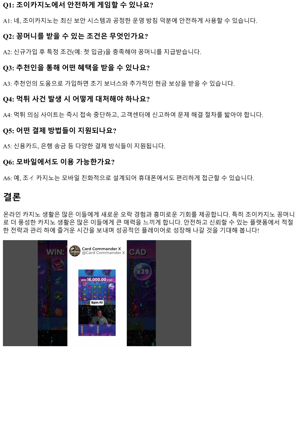 Q1: 조이카지노에서안전하게게임할수있나요? A1: 네, 조이카지노는최신보안시스템과공정한운영방침덕분에안전하게사용할수있습니다. Q2: 꽁머니를받을수있는조건은무엇인가요? A2: 신규가입후특정조건(예: 첫입금)을충족해야꽁머니를지급받습니다. Q3: 추천인을통해어떤혜택을받을수있나요? A3: 추천인의도움으로가입하면초기보너스와추가적인현금보상을받을수있습니다. Q4: 먹튀사건발생시어떻게대처해야하나요? A4: 먹튀의심사이트는즉시접속중단하고, 고객센터에신고하여문제해결절차를밟아야합니다. Q5: 어떤결제방법들이지원되나요? A5: 신용카드, 은행송금등다양한결제방식들이지원됩니다. Q6: 모바일에서도이용가능한가요? A6: 예, 조イ카지노는모바일친화적으로설계되어휴대폰에서도편리하게접근할수있습니다. 결론 온라인카지노생활은많은이들에게새로운오락경험과흥미로운기회를제공합니다. 특히조이카지노꽁머니 로더풍성한카지노생활은많은이들에게큰매력을느끼게합니다. 안전하고신뢰할수있는플랫폼에서적절 한전략과관리하에즐거운시간을보내며성공적인플레이어로성장해나갈것을기대해봅니다!