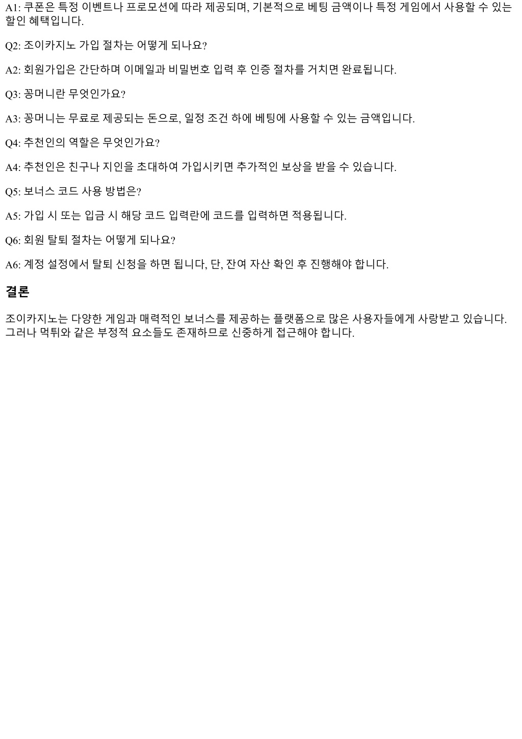 A1: 쿠폰은특정이벤트나프로모션에따라제공되며, 기본적으로베팅금액이나특정게임에서사용할수있는 할인혜택입니다. Q2: 조이카지노가입절차는어떻게되나요? A2: 회원가입은간단하며이메일과비밀번호입력후인증절차를거치면완료됩니다. Q3: 꽁머니란무엇인가요? A3: 꽁머니는무료로제공되는돈으로, 일정조건하에베팅에사용할수있는금액입니다. Q4: 추천인의역할은무엇인가요? A4: 추천인은친구나지인을초대하여가입시키면추가적인보상을받을수있습니다. Q5: 보너스코드사용방법은? A5: 가입시또는입금시해당코드입력란에코드를입력하면적용됩니다. Q6: 회원탈퇴절차는어떻게되나요? A6: 계정설정에서탈퇴신청을하면됩니다, 단, 잔여자산확인후진행해야합니다. 결론 조이카지노는다양한게임과매력적인보너스를제공하는플랫폼으로많은사용자들에게사랑받고있습니다. 그러나먹튀와같은부정적요소들도존재하므로신중하게접근해야합니다.