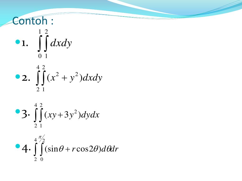 b. • dimana integral yang adadalamkurungharusdihitungterlebihdahuludenganmenganggap variable x konstanta, kemudianhasilnyadiintegralkembaliterhadap x. • Jika integral lipatduadiatasada, maka (a) dan (b) secaraumumakanmemberikanhasil yang sama.