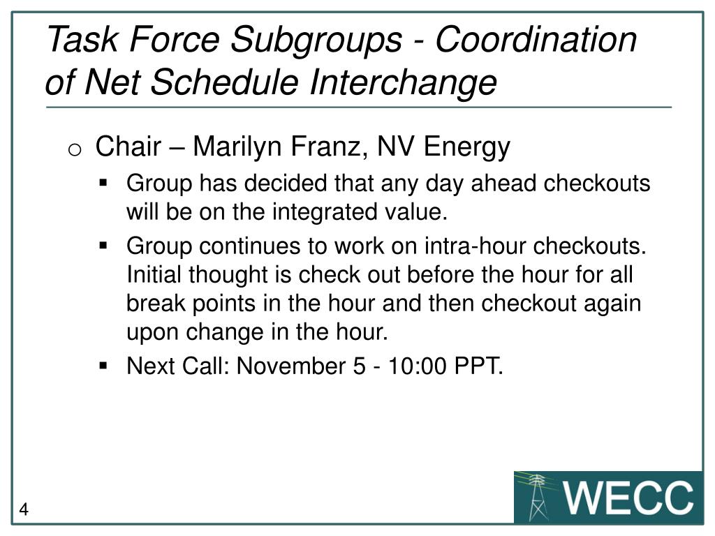 Task Force Subgroups - Coordination of Net Schedule Interchange • Chair – Marilyn Franz, NV Energy • Group has decided that any day ahead checkouts will be on the integrated value. • Group continues to work on intra-hour checkouts. Initial thought is check out before the hour for all break points in the hour and then checkout again upon change in the hour. • Next Call: November 5 - 10:00 PPT.