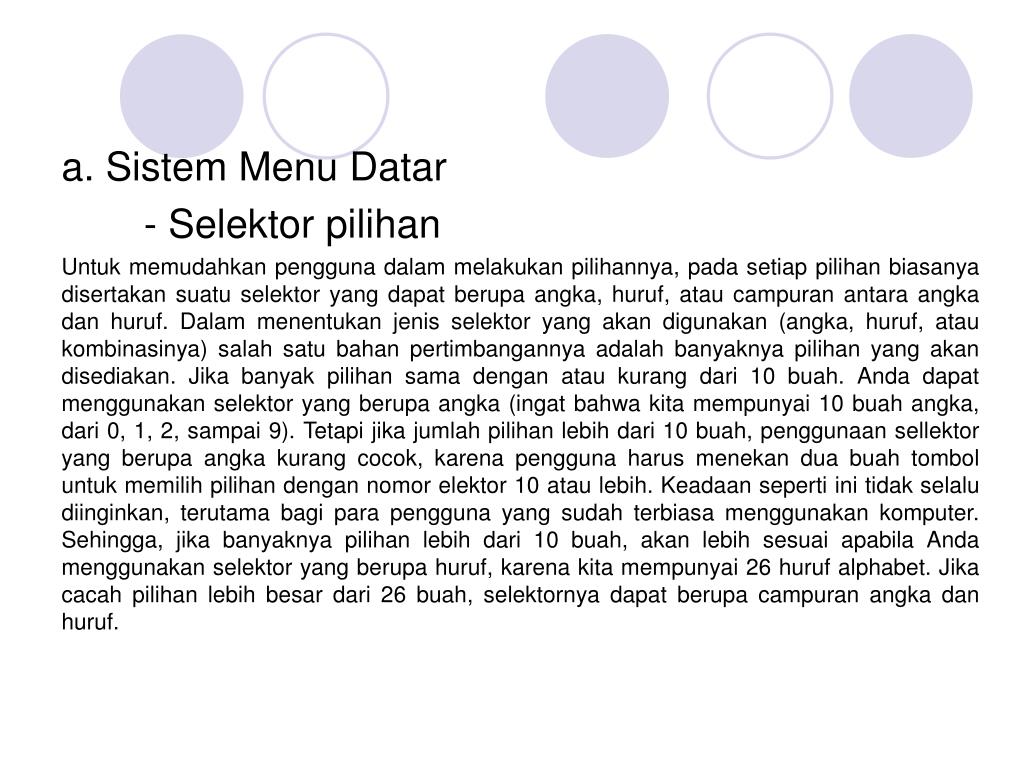 a. Sistem Menu Datar - Selektorpilihan Untukmemudahkanpenggunadalammelakukanpilihannya, padasetiappilihanbiasanyadisertakansuatuselektor yang dapatberupaangka, huruf, ataucampuranantaraangkadanhuruf. Dalammenentukanjenisselektor yang akandigunakan (angka, huruf, ataukombinasinya) salahsatubahanpertimbangannyaadalahbanyaknyapilihan yang akandisediakan. Jika banyak pilihansamadenganataukurang dari 10 buah. Andadapatmenggunakanselektor yang berupaangka (ingatbahwakitamempunyai 10 buahangka, dari 0, 1, 2, sampai 9). Tetapijikajumlahpilihanlebih dari 10 buah, penggunaansellektor yang berupaangkakurangcocok, karenapenggunaharusmenekanduabuahtomboluntukmemilihpilihandengannomorelektor 10 ataulebih. Keadaansepertiini tidak selaludiinginkan, terutamabagiparapengguna yang sudahterbiasamenggunakankomputer. Sehingga, jikabanyaknyapilihanlebih dari 10 buah, akanlebihsesuaiapabilaAndamenggunakanselektor yang berupahuruf, karenakitamempunyai 26 huruf alphabet. Jikacacahpilihanlebihbesar dari 26 buah, selektornyadapatberupacampuranangkadanhuruf.