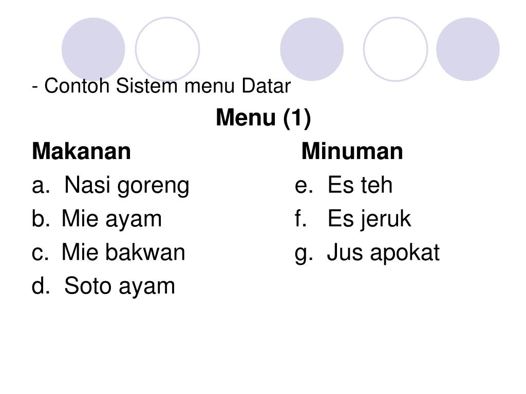 - ContohSistem menu Datar • Menu (1) • MakananMinuman • a. Nasigoreng e. Es teh • Mie ayam f. Es jeruk • Mie bakwan g. Jus apokat • d. Soto ayam