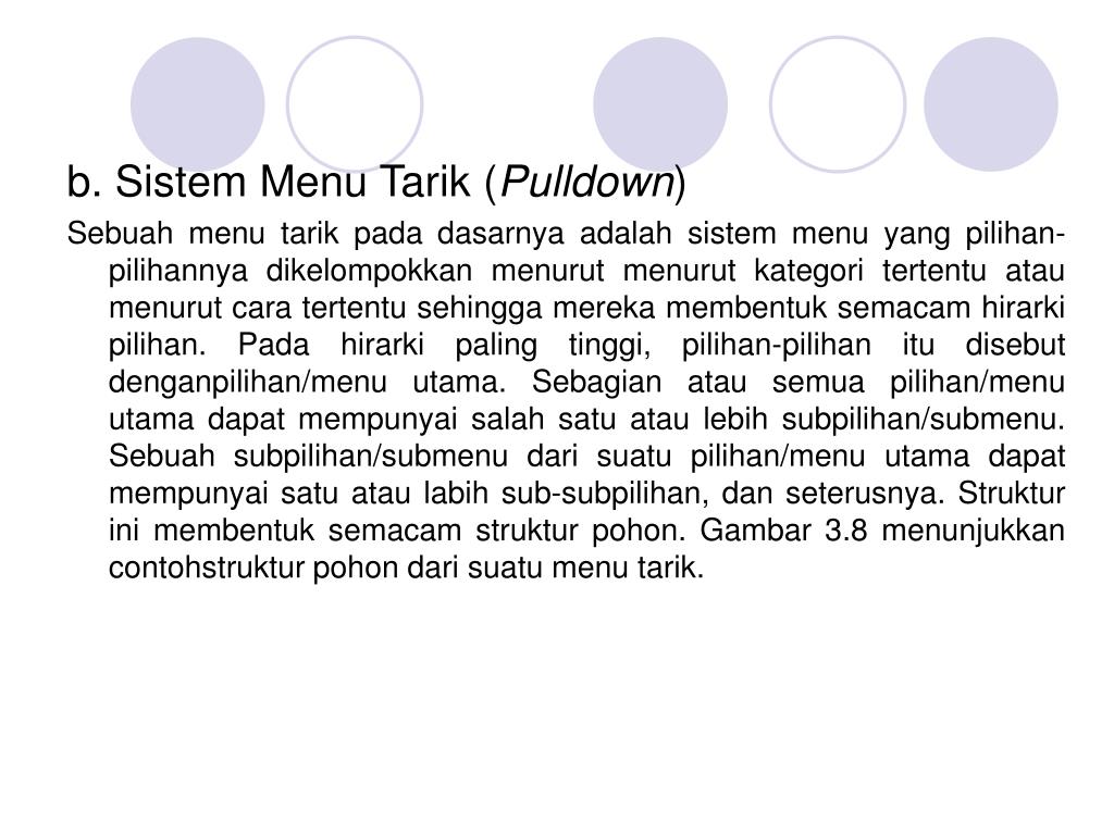 b. Sistem Menu Tarik (Pulldown) Sebuah menu tarik pada dasarnya adalah sistem menu yang pilihan-pilihannya dikelompokkan menurut menurut kategori tertentu atau menurut cara tertentu sehingga mereka membentuk semacam hirarki pilihan. Pada hirarki paling tinggi, pilihan-pilihan itu disebut denganpilihan/menu utama. Sebagian atau semua pilihan/menu utama dapat mempunyai salah satu atau lebih subpilihan/submenu. Sebuah subpilihan/submenu dari suatu pilihan/menu utama dapat mempunyai satu atau labih sub-subpilihan, dan seterusnya. Struktur ini membentuk semacam struktur pohon. Gambar 3.8 menunjukkan contohstruktur pohon dari suatu menu tarik.