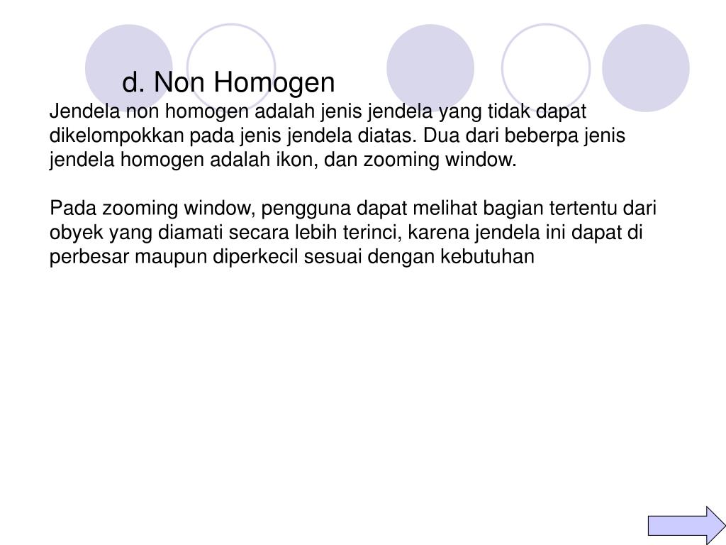d. Non Homogen Jendela non homogen adalah jenis jendela yang tidak dapat dikelompokkan pada jenis jendela diatas. Dua dari beberpa jenis jendela homogen adalah ikon, dan zooming window.Pada zooming window, pengguna dapat melihat bagian tertentu dari obyek yang diamati secara lebih terinci, karena jendela ini dapat di perbesar maupun diperkecil sesuai dengan kebutuhan