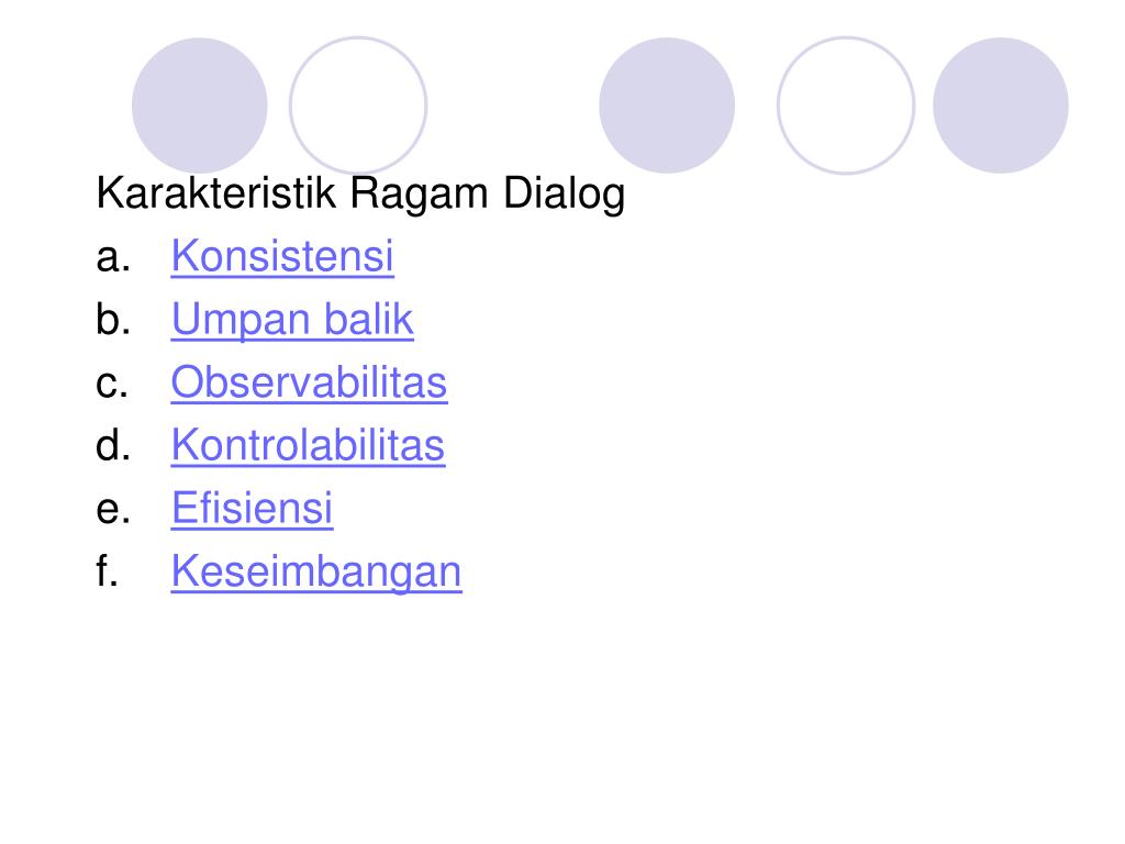 Karakteristik Ragam Dialog • Konsistensi • Umpan balik • Observabilitas • Kontrolabilitas • Efisiensi • Keseimbangan