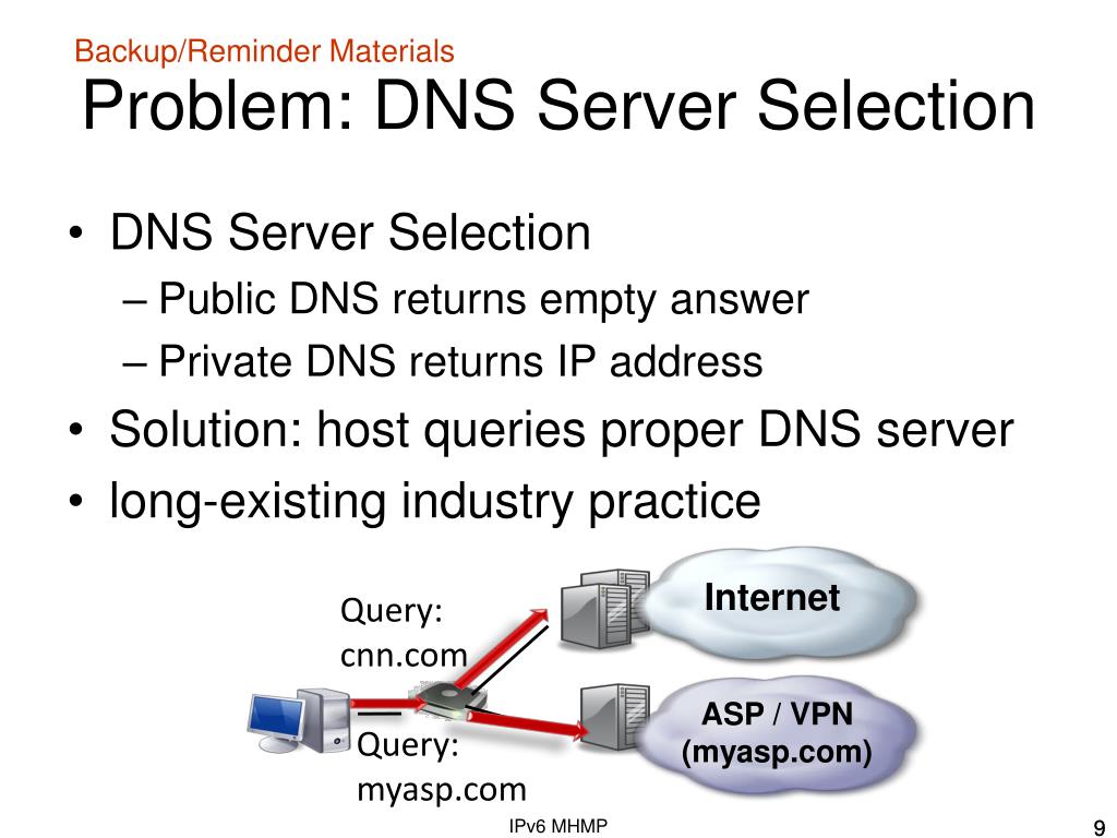 Backup/Reminder Materials Problem: DNS Server Selection • DNS Server Selection • Public DNS returns empty answer • Private DNS returns IP address • Solution: host queries proper DNS server • long-existing industry practice Internet Query: cnn.com NSP(Internet) ASP / VPN (myasp.com) Query: myasp.com 9