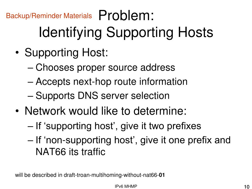 Problem: Identifying Supporting Hosts Backup/Reminder Materials • Supporting Host: • Chooses proper source address • Accepts next-hop route information • Supports DNS server selection • Network would like to determine: • If ‘supporting host’, give it two prefixes • If ‘non-supporting host’, give it one prefix and NAT66 its traffic will be described in draft-troan-multihoming-without-nat66-01 10